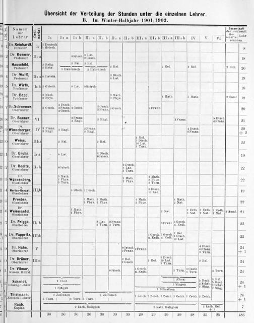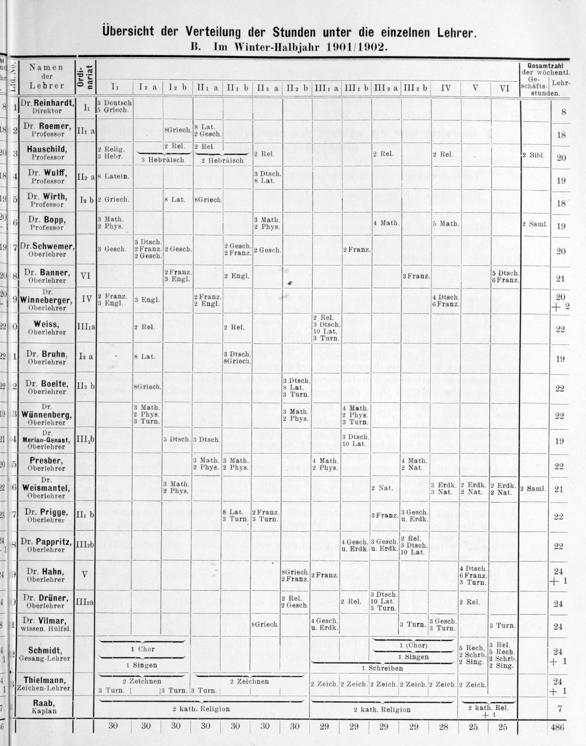 Ubersicht der Verteilung der Stunden unter die einzelnen Lehrer. — B. Im Winter-Halbjahr 1901/1902. 3.— Gesamtzahl 4 5 N umen 8½ E der wöchentl. 18 5—.———— Ge- Lehr- JI Lehrer 5 à 11 12a I² b IIi a II b II⸗ a II2 b III: a III b III a III2 b IV V VI el4trs —=ee—— 1—— 9 8 1[Dr. Reinhardt,] 1, s Deutsch Direktor 1 b Griech. V V V 8 „[Dr. Roemer s Datt;. ööööö, 18 2 Professor[IIi a Borleshe 2 Gesch. 18 ; 3 z KRei. 2 Rel. 4 IZI 20 3] RHauschild, 2 Relig. 2 Rel 2 Rel. 2 Rel 3 Professor 3 Hebr. Aebraisch 2 llebräisch 2 Bibl 20 Dr. Wulff, 3 Dtsch. 88 4 professor' IIe as Latein 8 Lat. 19 ———,————————————— 19 5Dr. Wirth 2 Griech. 8 Lat. SGriech. 9 5 1rh. eapan Iz b[ Griec- Lat. ſ8G risch 18 — 2—————————————-— 2 Dr. Bo 3 Math. 3 Math. 3 9r Eopp 2 Phys. 2 Phys 4 Math. 5 Math. 2 Saml. 19 3 Dtsch. n 19 7Dr. Schwemer 3 2 26G 2 Gesch.. 3 7 Oerenere, 3 Gesch. 2Pran. 2 Gesch. 2 Franz. ² Gesch 2 Franz. 20 371 Dr. Banner. 2branz RA„ne ach 20 8 annen, VI 3 Engl. 2 Engl.. 3 Franz 5reng, 21 20 Dr. 2 Pran,, Wnc.(arauzgÜ(+ 4 —. 4 Dtsch. 20 19 Wluneharger, IVß Engl. ¹Engl. 2 Engl. 6 Franz.+ 2 1 Ve IIj keirertr.. ö“ 2 eiss 2 Rel. 2 Rel, 3 Dtsch 5. 20 Oorwelerer IIIia 2 Rel 2 Rel 5OnSc 22 1 3—— 3 Turn.— 2 Dr. Bruhn. 3 Dtsch. 22 Oberlehrer 1e a 8 1at. SGriech. 19 22 2 Dr. Boelte,[IIe b sGriech. 3 nh⸗ V 22 Oberlehrer 3 Turn. Dr. 3 Math. 4 Math. 19 Z Wünnenberg, 2 Phys. 2 Mech. 2 Phys. 22 Operlehrer 3 Turn. Ys. 3 Turn. Dr. va““ 21 4 Werian-Genast,[IIIib 3 Dtsch. 3 Dtsch. 3 Dtsch. 7 Oberlehrer 1 10 Lat. 19 5 Presber, 3 Math. 3 Math 4 Math. 4 Math. o 5 opverlehrer 2 Phys. 2 Phys 2 Phys. 2 Nat. 22 11 Dr. RZ 5 ö la— 3 Math. 3 Erdk. 2 Erdk.[2 Erdk— 2 6 Weismantel 3 Wat 2 Nat. 3 Krük. e E nc. 2 Saml. 21 1 Oberlehrer“ 2 EAv8.— 4 18 Nat. 2 Nat. 2 Nat. Dr. Prigge 8 Lat. 2 Franz. a 5 3 Gesch. 5. 3 7 Orerrlhe. II b 3 Turn. 3 Turn. 3 Franz. u. Erdk. 22 1 SDr. Pappritz,[IIIp 4esch.8 Geseh s Boeh 24 ·1 Oberlehrer u. Erdk. u. Erdk. 10 Lat. 2 1 3— Dtsch. 5 19 Dr. Hahn SGriech.ſ- 4 24 4 9 b berne V 2Prang 2 Franz. V Seran⸗+ 1 TDr. Drüner 2 Rel. 3 Dtsch.— 1( overlehrer“[IIIa 2 Gesch. 2 Rel 10 at. V 2 Rel. 24 Dr. Vilmar ret a 4 Gesch. 3 Gesch 8 11 wissen Hulfzl. SGriech. u. Erdkk. V 3 rara. Turn 3 Turn 24 1Scechmidt, 1 Chor V— 3 Rech, 8 Kelh 24 1desang-Lehrer— 1 Singen 2 Sing. ² Schrb+ 1 11 1 Singen 1—iCchreiben 2 Sing 4 Thielmann, 2 Zeichnen 2 Zeichnen, e e„ eh 5 Dn 24 3., I 2 Z. 2 Zeich. 2 Zeich. 2 Zeich. 2 Zeich. 2 Zeich. 2 Zeich 12 1 Zeichen-Lehrer. 3 Turn. 13 Turn. 3 Turn. 1 1 816 † 1 Raab„ 7 Kaplan 2 kath. Religion 2 kath. Religion 2 Korb. Kel. 7 6 30 30 30 30 30 30 ſ/ 30 29 29 29 29 28 ſ 25 25 486