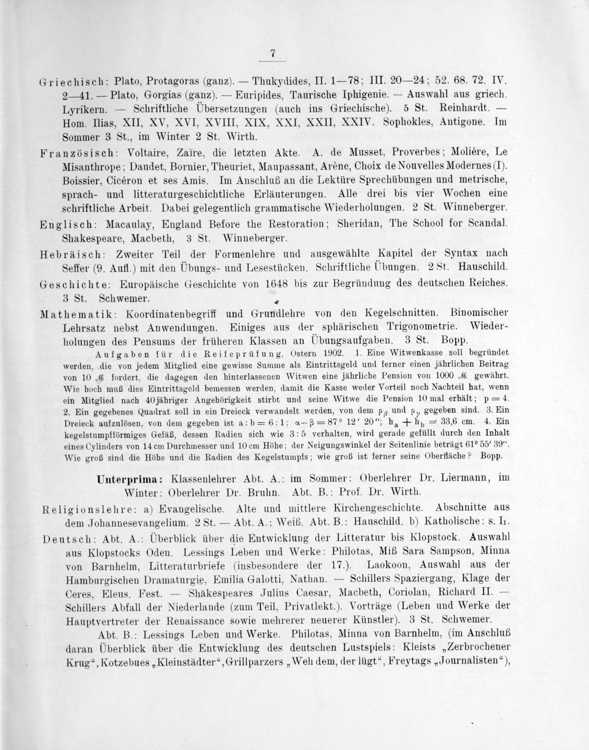 7 Griechisch: Plato, Protagoras(ganz).— Thukydides, II. 1— 78; III. 20— 24; 52. 68. 72. IV. 2— 41.— Plato, Gorgias(ganz).— Euripides, Taurische Iphigenie.— Auswahl aus griech. Lyrikern.— Schriftliche Übersetzungen(auch ins Griechische). 5 St. Reinhardt.— Hom. Ilias, XII, XV, XVI, XVIII, XIX, XXI, XXII, XXIV. Sophokles, Antigone. Im Sommer 3 St., im Winter 2 St. Wirth.