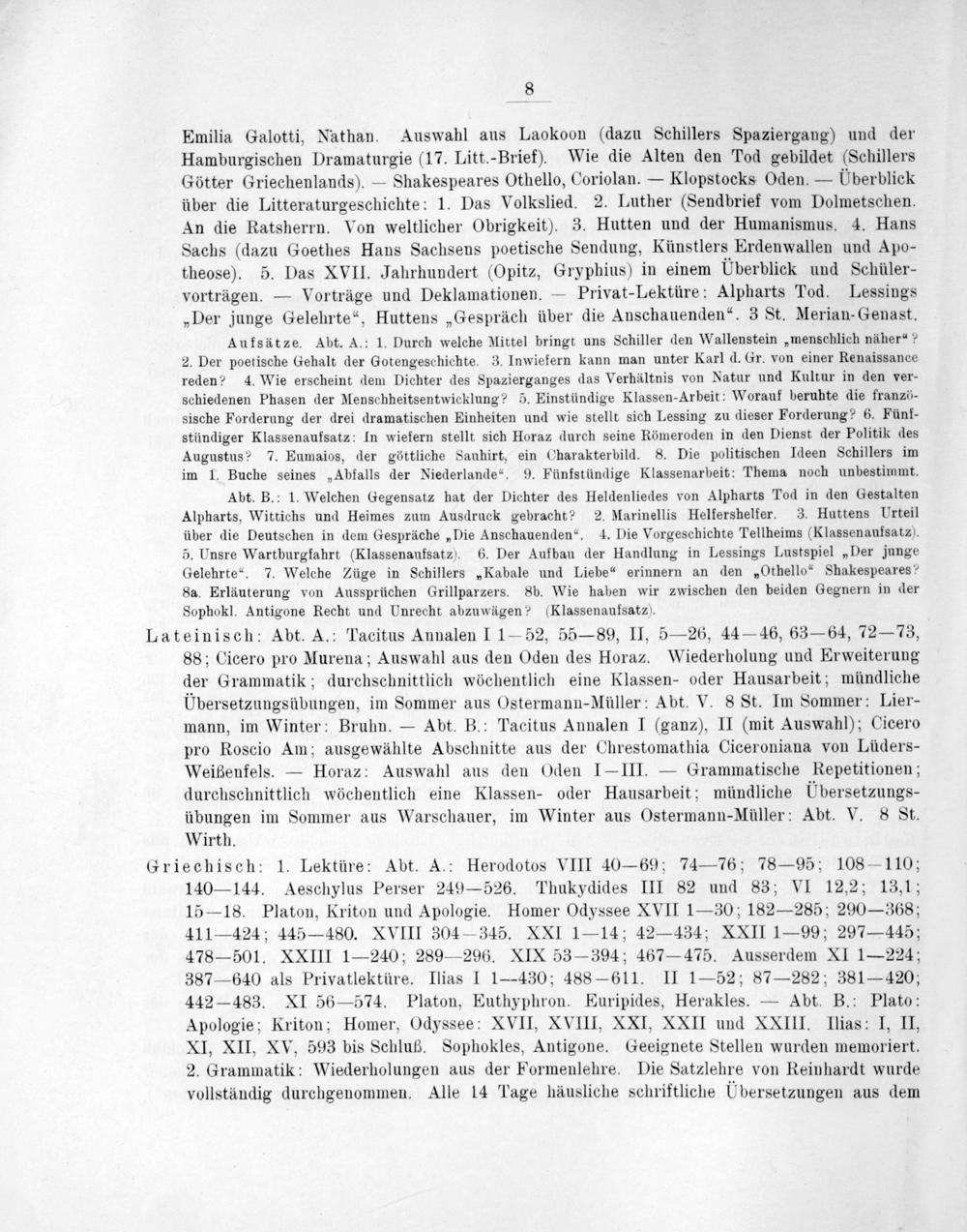 8 Emilia Galotti, Nathan. Auswahl aus Laokoon(dazu Schillers Spaziergang) und der Hamburgischen Dramaturgie(17. Litt.-Brief). Wie die Alten den Tod gebildet(Schillers Götter Griechenlands).— Shakespeares Othello, Coriolan.— Klopstocks Oden.— Überblick über die Litteraturgeschichte: 1. Das Volkslied. 2. Luther(Sendbrief vom Dolmetschen. An die Ratsherrn. Von weltlicher Obrigkeit). 3. Hutten und der Humanismus. 4. Hans Sachs(dazu Goethes Hans Sachsens poetische Sendung, Künstlers Erdenwallen und Apo- theose). 5. Das XVII. Jahrhundert(Opitz, Gryphius) in einem Überblick und Schüler- vorträgen.— Vorträge und Deklamationen.— Privat-Lektüre: Alpharts Tod. Lessings „Der junge Gelehrte“, Huttens„Gespräch über die Anschauenden“. 3 St. Merian-Genast.
