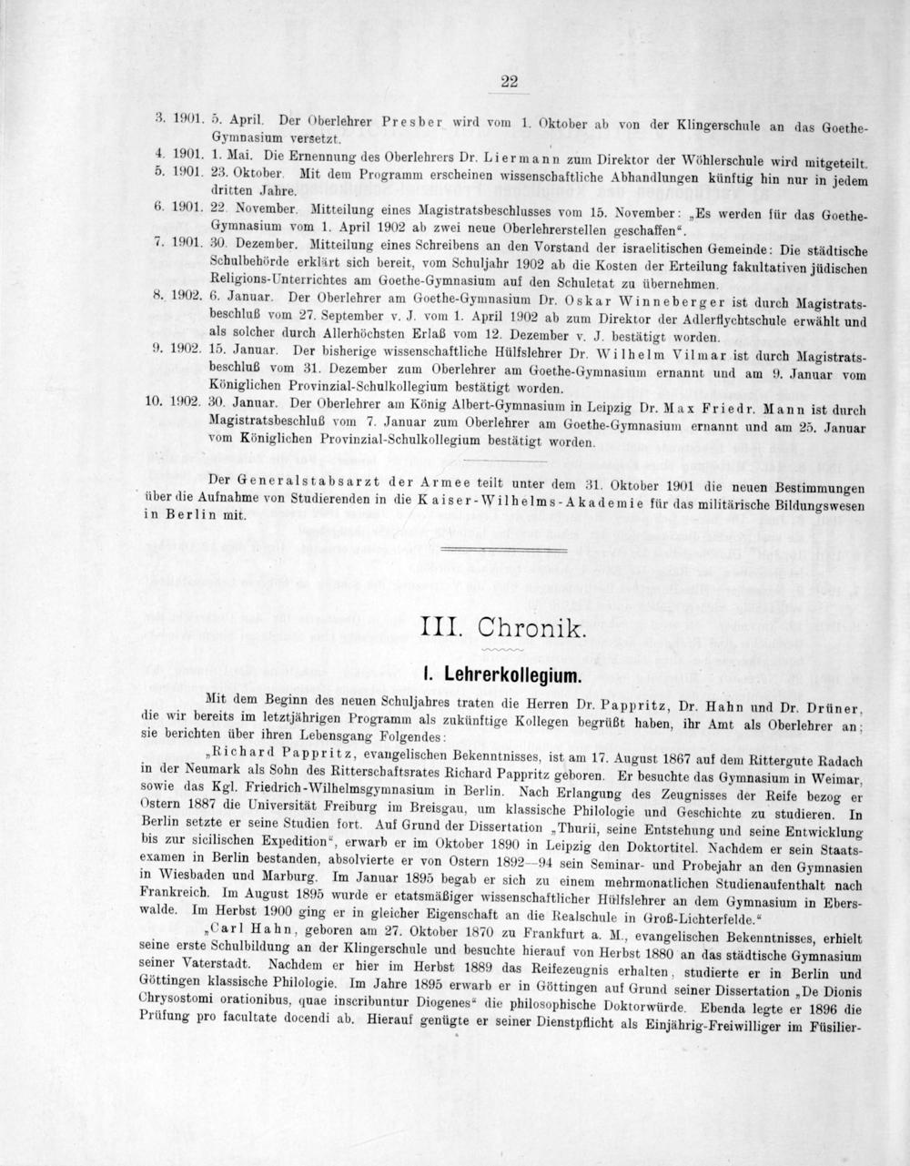 Mit dem Beginn des neuen Schuljahres traten die Herren Dr. Pappritz, Dr. Hahn und Dr. Drüner, die wir bereits im letztjährigen Programm als zukünftige Kollegen begrüßt haben, ihr Amt als Oberlehrer an; sie berichten über ihren Lebensgang Folgendes: