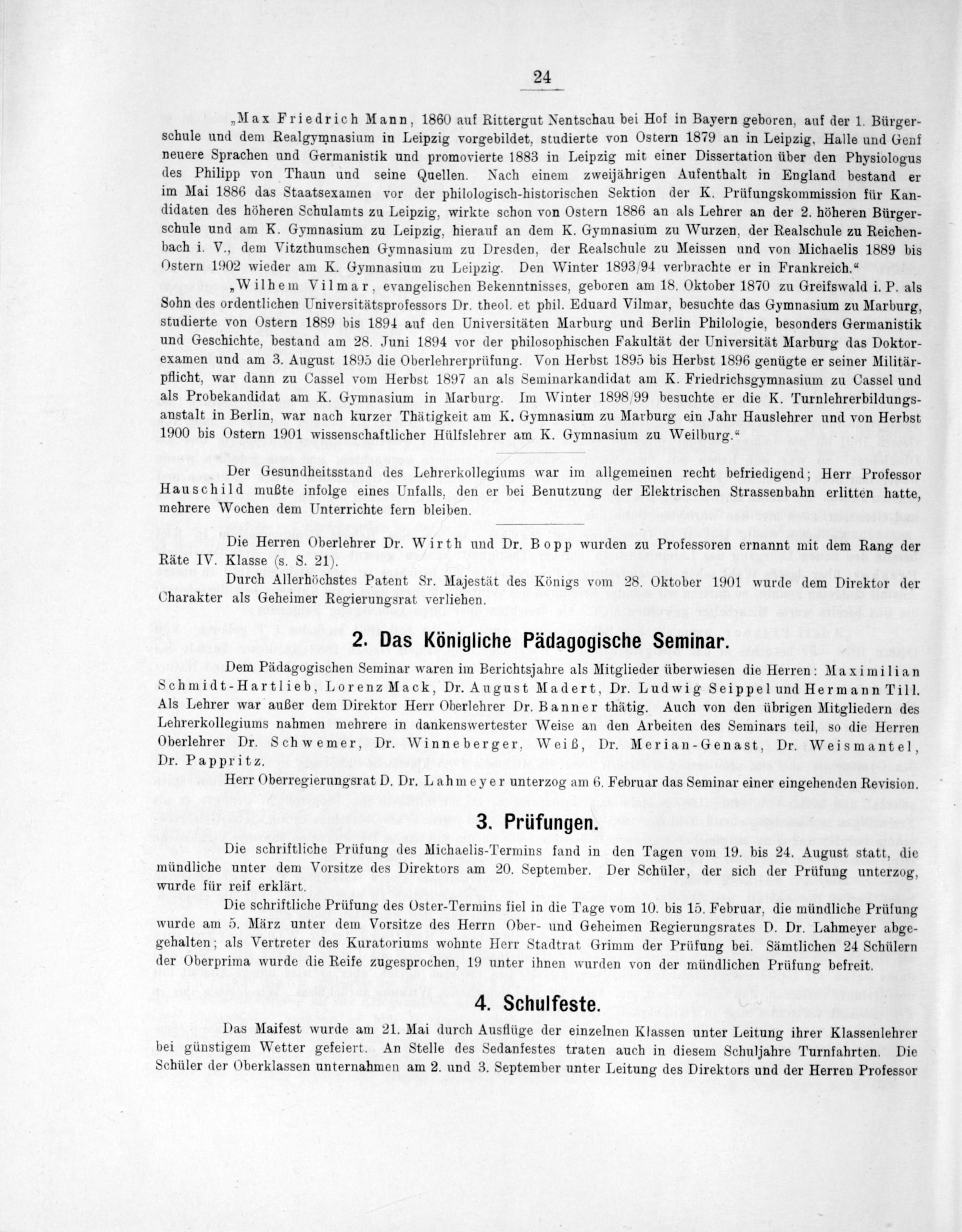 „Max Friedrich Mann, 1860 auf Rittergut Nentschau bei Hof in Bayern geboren, auf der 1. Bürger- schule und dem Realgymnasium in Leipzig vorgebildet, studierte von Ostern 1879 an in Leipzig. Halle und Genf neuere Sprachen und Germanistik und promovierte 1883 in Leipzig mit einer Dissertation über den Physiologus des Philipp von Thaun und seine Quellen. Nach einem zweijährigen Aufenthalt in England bestand er im Mai 1886 das Staatsexamen vor der philologisch-historischen Sektion der K. Prüfungskommission für Kan- didaten des höheren Schulamts zu Leipzig, wirkte schon von Ostern 1886 an als Lehrer an der 2. höheren Bürger- schule und am K. Gymnasium zu Leipzig, hierauf an dem K. Gymnasium zu Wurzen, der Realschule zu Reichen- bach i. V., dem Vitzthumschen Gymnasium zu Dresden, der Realschule zu Meissen und von Michaelis 1889 bis Ostern 1902 wieder am K. Gymnasium zu Leipzig. Den Winter 1893/94 verbrachte er in Frankreich.“