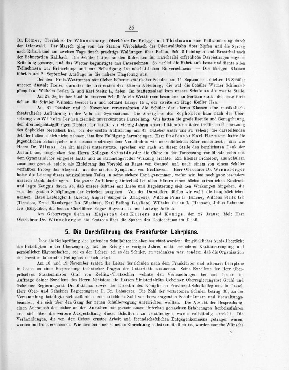 Dr. Römer, Oberlehrer Dr. Wünnenberg, Oberlehrer Dr. Prigge und Thielmann eine Fußwanderung durch den Odenwald. Der Marsch ging von der Station Wiebelsbach der Odenwaldbahn über Zipfen und die Spreng nach Erbach und am zweiten Tage durch prächtige Waldungen über Bullau, Schloß Leiningen und Ernstthal nach der Bahnstation Kailbach. Die Schüler hatten an den Ruheorten für mancherlei erfreuliche Darbietungen eigener Erfindung gesorgt, und das Wetter begünstigte das Unternehmen. So verlief die Fahrt aufs beste und diente allen Teilnehmern zur Erfrischung und zur Befestigung freundschaftlichen Einvernehmens.— Die übrigen Klassen führten am 2. September Ausflüge in die nähere Umgebung aus.