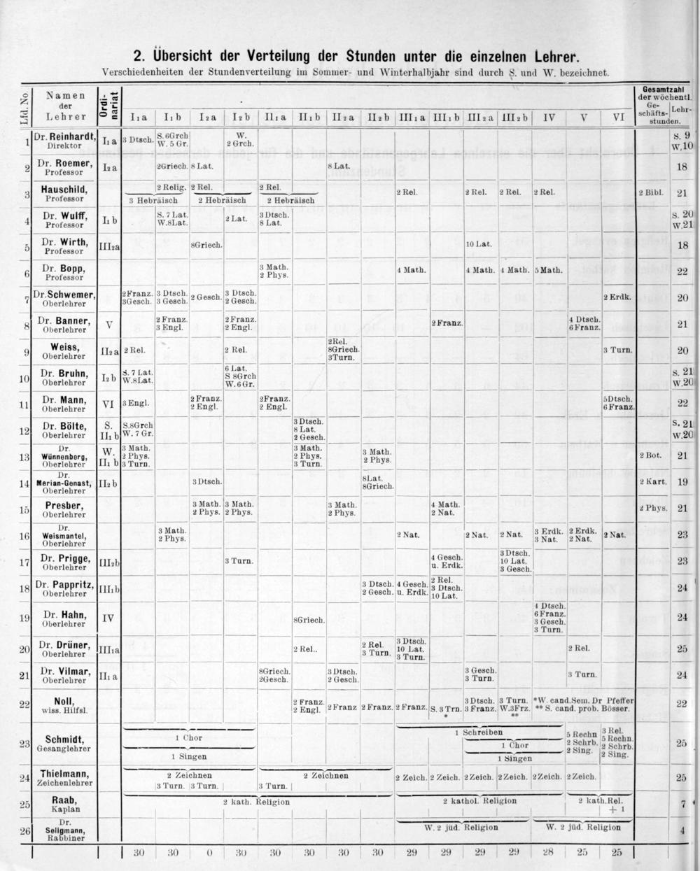—— desamtzahl 2 Namen 5 der wöchentl. — der 5 5— ekäfis- lehr- 2ſLehrer 2 I1a IIrb I2 a Izb IIlra IIIb IIza II2b IIIra IIII b IIIza III= b IV V VI Lrunden. 1—— Dr. Reinhardt 8 6Grch w. ⸗2 1ſ= Direktor La B Dtsch. W. 5 Gr. 2 Grch. V w, 10 D Roemer, 88.—* 2* 4 T. 26riech. 8 Lat. Lat. 2 Professor Iza 2rieg 4 18 3Rauschild. 2Relig. 2 Rol. eKel 2 Rel 2Rel. 2 Rel. 2 Rel. ² Bibl. 21 3 Professor 3 Hebräisch 2 Hebräisch 2 Hebräisch — 2-oraso.——————— 4 Dr. Wulff, S. 7Lat. 3 Dtsch. S. 20 4 Professor Ii b W. SLat. 2Lat. s Lat. w.21 ———————————,— — Dr. Wirth, SGriech. 10 Lat. 5Professor IIIza rigon 18 Dr. Bopp 3 Math. 4 Math 4 Math. 4 Math. 5 Math. V 2 6 Professor 2 Phys. 22 —— 5———————— Dr. Schwemer. 2Franz. 3 Dtsch. 3 Dtsch. 6 3 9danneme 6 3Gesch. 3 Gesch. 2 Gesch. har Gesch. 2 Erdk 20 —— 1——————— Dr. Banner. 7 2 Franz. 2 Franz. 7 4 Dtsch— 8 Oberfehrer W 3 Engl. 2 Engl. 2ranz 6 Franz 21 ——————-— 9————— Weiss, 2Rel. 2 Rel 2 Rel. sGriech. 3 Turn. 9 overlehrer IIza 3 Turn. 20 .— at. 5 I 3 5 Inͤ 1 Dr. Bruhn, 8. 7 Lat S'serch S. 21 10 Oberlehrer“ Ia b W. SLat. W. 6 Gr. V W. 20 ————— 2——————————— Dr. Mann 7 2 Franz. lrne 5Dtsch.. 11 Oberlehrer VI Enl 2 Engl. 2 Engl V 6 Franz. 2² 12 Dr. Bölte, S. SsGren AVraoh s. 21 Oberlehrer Ijb-.7Gr Gosch————"20 PDr. f W. s Math.— 3 Math 3 Math 4 5 Wünnenber 1[2 Phys. 2 Phys. 1 4 2 Bot. 21 13 dvorlohror- IIn b 3 Turn. 3 Turn. 2 Phys. 3 ſ 4 De. SLat 14] Merian-Genast, III2 b 3 Dtsch. SGriech 2 Kart. 19 Oberlehrer 3 5———————— FPresber 3 Math. 3 Math. 3 Math 4 Math. 9 15 overlehrer 2 Thys. 2 Phys. 2 Phys 2 Nat. 2 Phys. 21 ———————— Dr. 3 Math.. 3 Erdk. 2 Prdk. 16 98 2 Phys 2 Nat a Nat 2 Nat. 3 Nat. 2 Nat. 2 Nat. 23 3. 8— 5 3Dtsch.— Dr. Prigge 3 Turn V 4 Gesch. 10 Lat. 17 overlehter“[III2b u. Erdk. 3 Gesch. 3 Gesch. 23 ——,„ 2 Rel.———— Dr. Pappritz 3 Dtsch. 4 Gesch. ² 5 18 Overlbhrer»IlIib 2 Gesch. u. Erdk. 8 Dtsch 24 ——— ſto Lat.——— —— 4 Dtsch Dr. Hahn ag 6 Franz. 19 Oberlehrer IV 8rlech. 3 Gesch. 24 4— 3 Turn.—— 0—1Dr. Drüner 5 2 Rel. 3 Dtsch Rer 92 20 Oberlehrer IIIia 2Rel- 3 Tuürh. 10 Lar 5.—— 25 Dr. Vimar, sGriech. 3 Dtsch. 3 Gesch„ 21 oberlehrer“[IIia 2Gesch. 2 Gesch. 3 Turn. 3 Turn 24 22 Noll, 2 Franz. 3Dtsch. 3 Turn.„W. cand. Sem. Dr Pfeffer 22 wiss. Hilfsl. 2 Engl. ²Franz 2 Franz. 2 Franz. S. 3 Trn. 3 Franz. W.E rz.* S. cand. prob. Bösser. * — 1 Schreiben 3 Rel. 23G Schmicdt, 1 Chor J 5Roohn 5Eecha. 25 —0 Gesanglehrer 1 Chor 2 Sing. 2 Sohrb. 234 1 Singen 1 Singen— 25 235— ,.—— 24 Ihielmann, 2 Zeichnen 2 Zeichnen 2 Zeich. 2 Zeich. 2 Zeich. 2Zeich. 2Zeich. 2Zeich. 25 Zeichenlehrer 3 Turn. 3 Turn. 3 Turn. 25 Raab, 2 kath. Religion 2 kathol. Religion 2 kath. Rel. 74 8 Kaplan+ 1 ————————— 26¹SellDnanm. F=d Relgion Wclan 4 2 Rabbiner f. 30 30 0 ſ 30 30 30 30 30 29 29 29 29 28 25 25