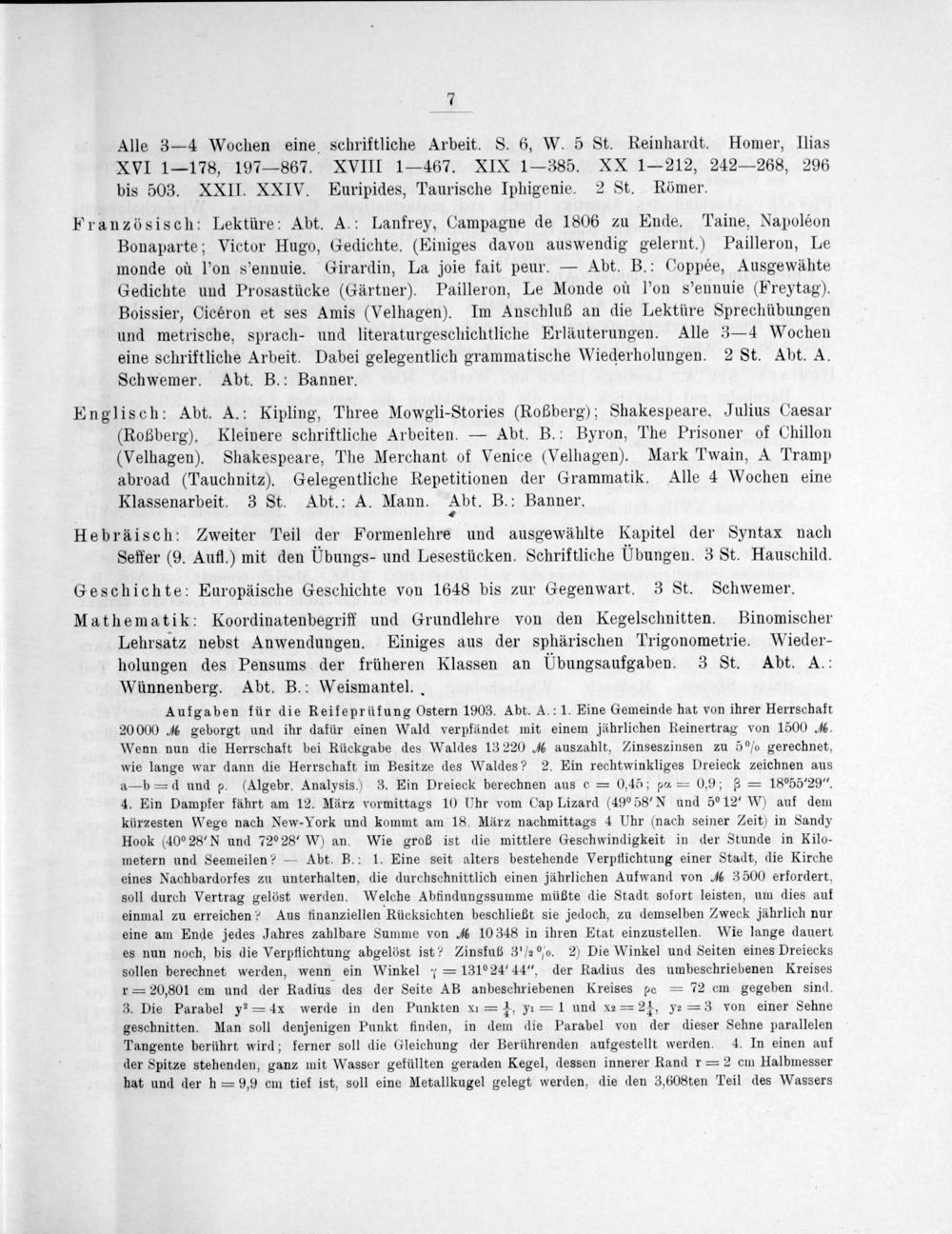 Englisch: Abt. A.: Kipling, Three Mowgli-Stories(Roßberg); Shakespeare. Julius Caesar (Roßberg). Kleinere schriftliche Arbeiten.— Abt. B.: Byron, The Prisoner of Chillon (Velhagen). Shakespeare, The Merchant of Venice(Velhagen). Mark Twain, A Tramp abroad(Tauchnitz). Gelegentliche Repetitionen der Grammatik. Alle 4 Wochen eine Klassenarbeit. 3 St. Abt.: A. Mann. Abt. B.: Banner.