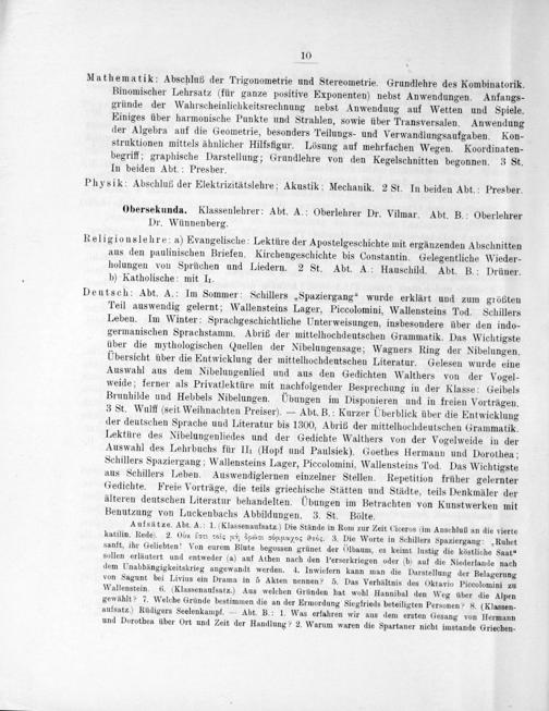 Deutsch: Abt. A.: Im Sommer: Schillers„Spaziergang“ wurde erklärt und zum größten Teil auswendig gelernt; Wallensteins Lager, Piccolomini, Wallensteins Tod. Schillers Leben. Im Winter: Sprachgeschichtliche Unterweisungen, insbesondere über den indo- germanischen Sprachstamm. Abriß der mittelhochdeutschen Grammatik. Das Wichtigste über die mythologischen Quellen der Nibelungensage; Wagners Ring der Nibelungen.
