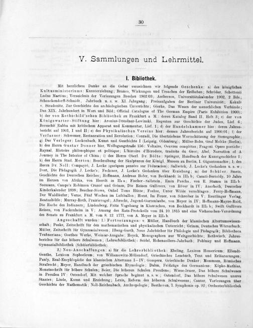 Mit herzlichem Danke an die Geber verzeichnen wir folgende Geschenke: a) des königlichen Kultusministeriums: Kunsterziehung; Branco, Wirkungen und Ursachen der Erdbeben; Schröder, Schottenii Ludus Martius; Verzeichnis der Vorlesungen Breslau 1902/03; Ascherson, Universitätskalender 1902, 2 Bde.; Schenckendorff-Schmidt, Jahrbuch u. s. w. XI. Jahrgang; Preisaufgaben der Berliner Universität; Kekulé v. Stradonitz, Zur Geschichte des archäologischen Unterrichts; Gierke, Das Wesen der menschlichen Verbände; Das XIX. Jahrhundert in Wort und Bild; Official Catalogue of The German Empire(Paris Exhibition 1900); b) der von Rothschild'schen Bibliothek zu Frankfurt a M.: deren Katalog Band II, Heft 3; c) der von Königswarter-Stiftung hier: Aronius-Dresdner-Lewinski, Regesten zur Geschichte der Juden, Lief 6; Bereschit Rabba mit kritischem Apparat und Kommentar, Lief. 1; d) der Handelskammer hier: deren Jahres- bericht auf 1901, I und II; e) des Physikalischen Vereins hier: dessen Jahresbericht auf 1900/01; 1) der Verfasser: Schwemer, Restauration und Revolution; Conradi, Die übertriebene Wertschätzung der Stenographie; g) Der Verleger: Luckenbach, Kunst und Geschichte I(Leipzig, Oldenburg); Müller-Bohn, Graf Moltke(Berlin), h) des Herrn Gustav Donner hier, Wolfsgangstraße 156: Voltaire, Oeuvres complètes; Fragoni Opere poeriche; Raynal, Histoire philosophique et politique; Lhistoire d'Hérodote, traduite du Grec; Abel, Narration of A Journey in The Interior of China; i) des Herrn Oberl. Dr. Bölte: Springer, Handbuch der Kunstgeschichte I; k) des Herrn Stud. Merton: Beschreibung der Skulpturen der Königl. Museen zu Berlin, I. Gigantomachie; 1) des Herrn Dr. Noll: Compayré, J. Locke(quelques pensées sur l'éducation); Sallwürk, J. Locke's Gedanken u. s. w; Dost, Die Pädagogik J. Locke's; Fechtner, J. Locke’s Gedanken über Erziehung; m) der Schüler: Smets, Geschichte des Deutschen Reiches; Hoffmann, Andreas Hofer, von Beckhardt in IIII b; Casati-Bertoldy, 10 Jahre im Herzen von Afrika, von Heerdt in IIa a; Fischer-Sallstein, Emin Pascha, von E. Stamm in IIIe b: Seemann, Campe's Robinson Crusoté und Grimm, Die Reisen Gullivers, von Röver in IV; Auerbach, Deutscher Kinderkalender 1898; Beecher-Stowe, Onkel Toms Hütte; Foehse, Unter Wilde verschlagen; Ferry-Hoffmann, Der Waldläufer; Verne. Fünf Wochen im Luftballon; Horst, Im Feuer, von Schreiber in V; Reutlinger Verlag, Beatushöhle; Murray-Roth, Prairievogel; Albrecht, Jugend-Gartenlaube, von Meyer in IV; Hoffmann-Mayne-Raid, Die Rache des Indianers; Lindenberg, Fritz Vogelsang in Kiautschou, von Beckhardt in III b; Swift Gullivers Reisen, von Fackenheim in V; Auszug des Rats-Protokolls vom 24. 10. 1815 und eine Viehseuchen-Verordnung des Senats zu Frankfurt a. M. vom 8. 12. 1777, von A. Meyer in III b.