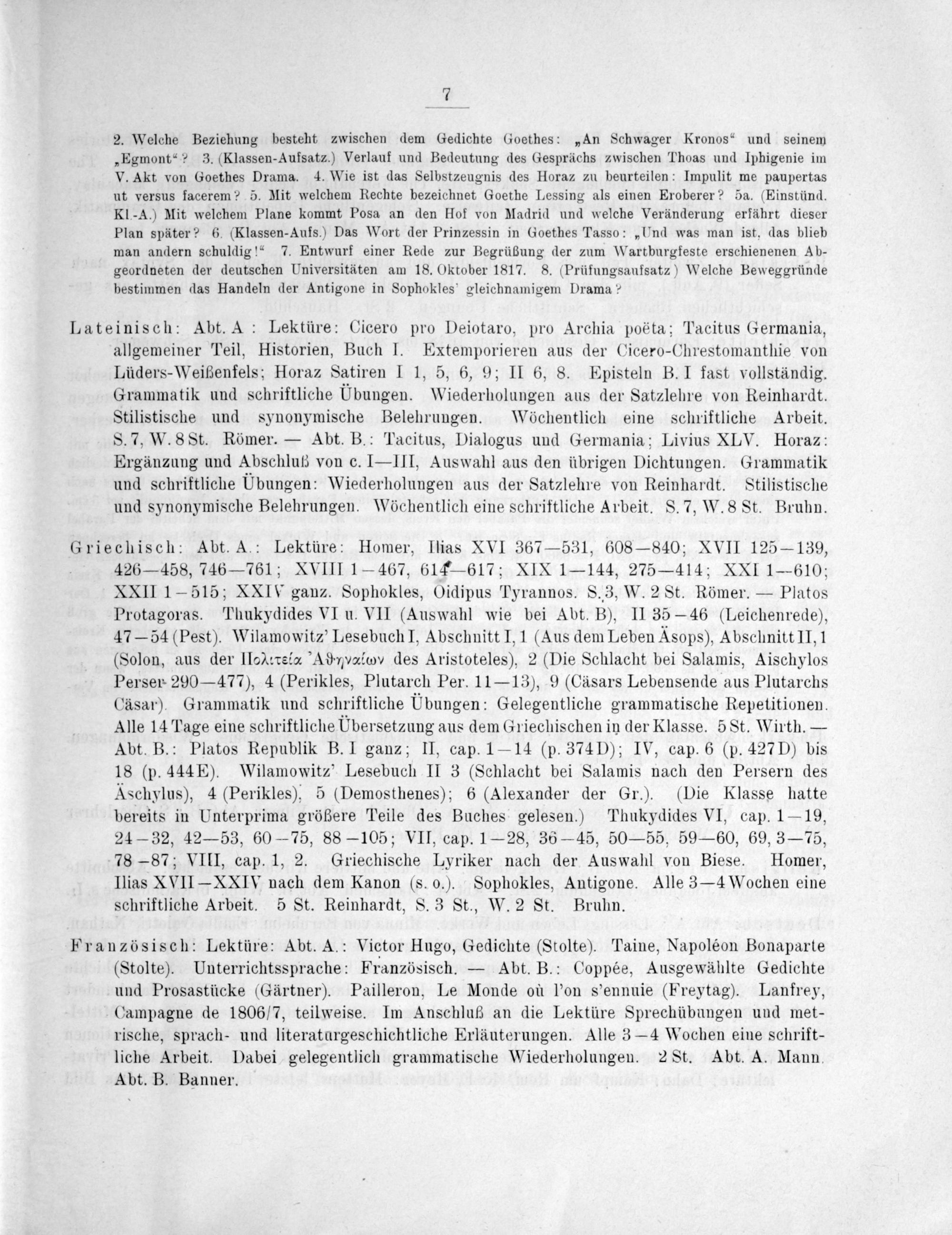 Lateinisch: Abt. A: Lektüre: Cicero pro Deiotaro, pro Archia poëta; Tacitus Germania, allgemeiner Teil, Historien, Buch I. Extemporieren aus der Cicero-Chrestomanthie von Lüders-Weißenfels; Horaz Satiren I 1, 5, 6, 9; II 6, 8. Episteln B. I fast vollständig. Grammatik und schriftliche Dbungen. Wiederholungen aus der Satzlehre von Reinhardt. Stilistische und synonymische Belehrungen. Wöchentlich eine schriftliche Arbeit. S. 7, W. 8St. Römer.— Abt. B.: Tacitus, Dialogus und Germania; Livius XLV. Horaz: Ergänzung und Abschlut von c.—III, Auswahl aus den übrigen Dichtungen. Grammatik und schriftliche Dbungen: Wiederholungen aus der Satzlehre von Reinhardt. Stilistische und synonymische Belehrungen. Wöchentlich eine schriftliche Arbeit. S. 7, W. 8 St. Bruhn.