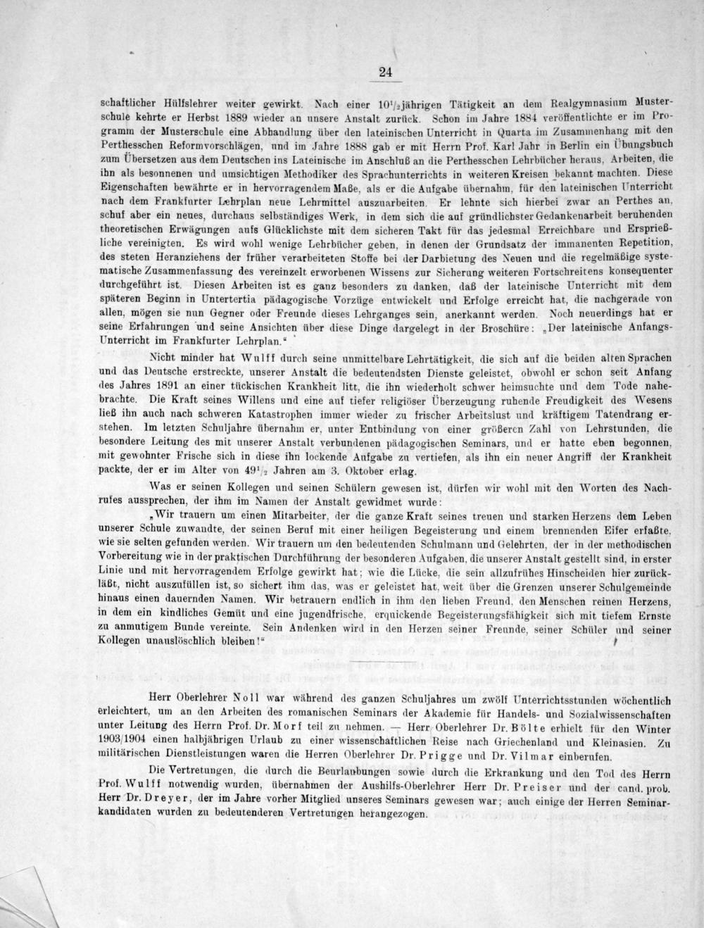 Nicht minder hat Wulff durch seine unmittelbare Lehrtätigkeit, die sich auf die beiden alten Sprachen und das Deutsche erstreckte, unserer Anstalt die bedeutendsten Dienste geleistet, obwohl er schon seit Anfang des Jahres 1891 an einer tückischen Krankheit litt, die ihn wiederholt schwer heimsuchte und dem Tode nahe- brachte. Die Kraft seines Willens und eine auf tiefer religiöser Überzeugung ruhende Freudigkeit des Wesens ließ ihn auch nach schweren Katastrophen immer wieder zu frischer Arbeitslust und kräftigem Tatendrang er- stehen. Im letzten Schuljahre übernahm er, unter Entbindung von einer größeren Zahl von Lehrstunden, die besondere Leitung des mit unserer Anstalt verbundenen pädagogischen Seminars, und er hatte eben begonnen, mit gewohnter Frische sich in diese ihn lockende Aufgabe zu vertiefen, als ihn ein neuer Angriff der Krankheit packte, der er im Alter von 49 ½ Jahren am 3. Oktober erlag.