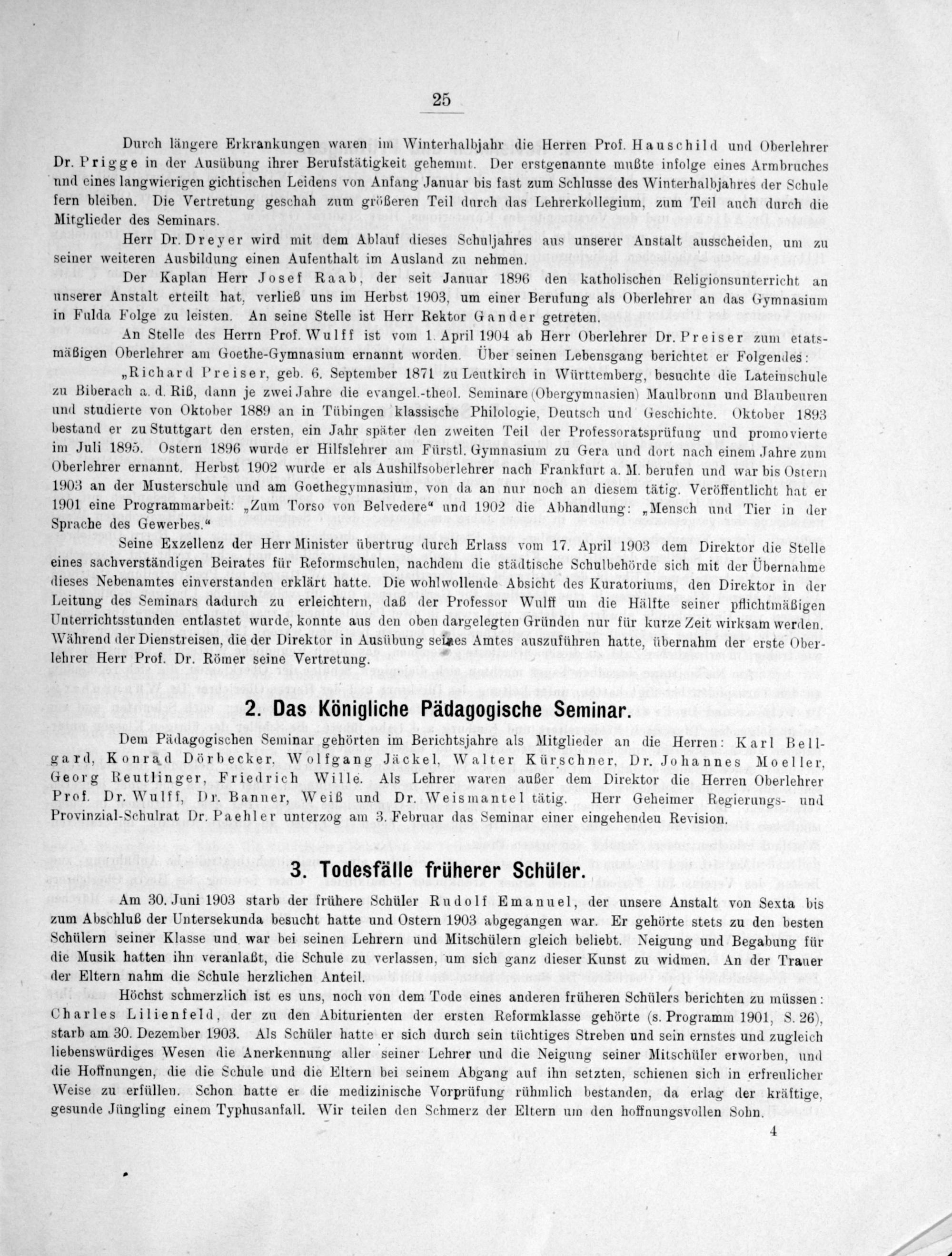 An Stelle des Herrn Prof. Wulff ist vom 1. April 1904 ab Herr Oberlehrer Dr. Preiser zum etats- mäßigen Oberlehrer am Goethe-Gymnasium ernannt worden. Über seinen Lebensgang berichtet er Folgendes: