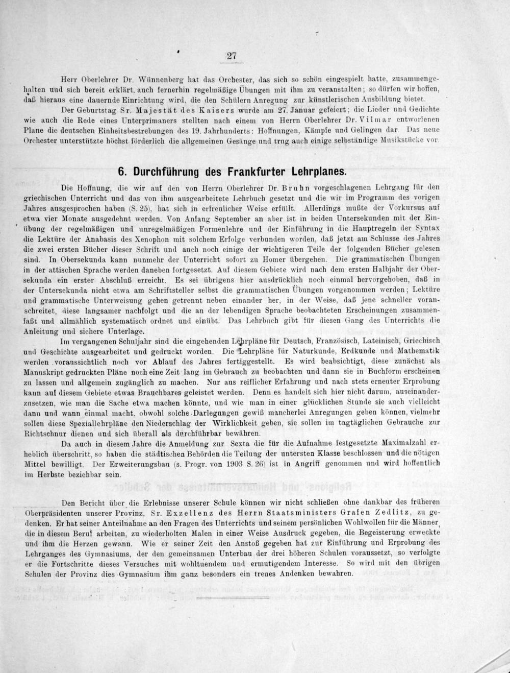 . Den Bericht über die Erlebnisse unserer Schule können wir nicht schließen ohne dankbar des früheren Oberpräsidenten unserer Provinz, Sr. Exzellenz des Herrn Staatsministers Grafen Zedlitz, zu ge— denken. Er hat seiner Anteilnahme an den Fragen des Unterrichts und seinem persönlichen Wohlwollen für die Männer, die in diesem Beruf arbeiten, zu wiederholten Malen in einer Weise Ausdruck gegeben, die Begeisterung erweckte und ihm die Herzen gewann. Wie er seiner Zeit den Anstoß gegeben hat zur Einführung und Erprobung des Lehrganges des Gymnasiums, der den gemeinsamen Unterbau der drei höheren Schulen voraussetzt, so verfolgte er die Fortschritte dieses Versuches mit wohltüendem und ermutigendem Interesse. So wird mit den übrigen Schulen der Provinz dies Gymnasium ihm ganz besonders ein treues Andenken bewahren.