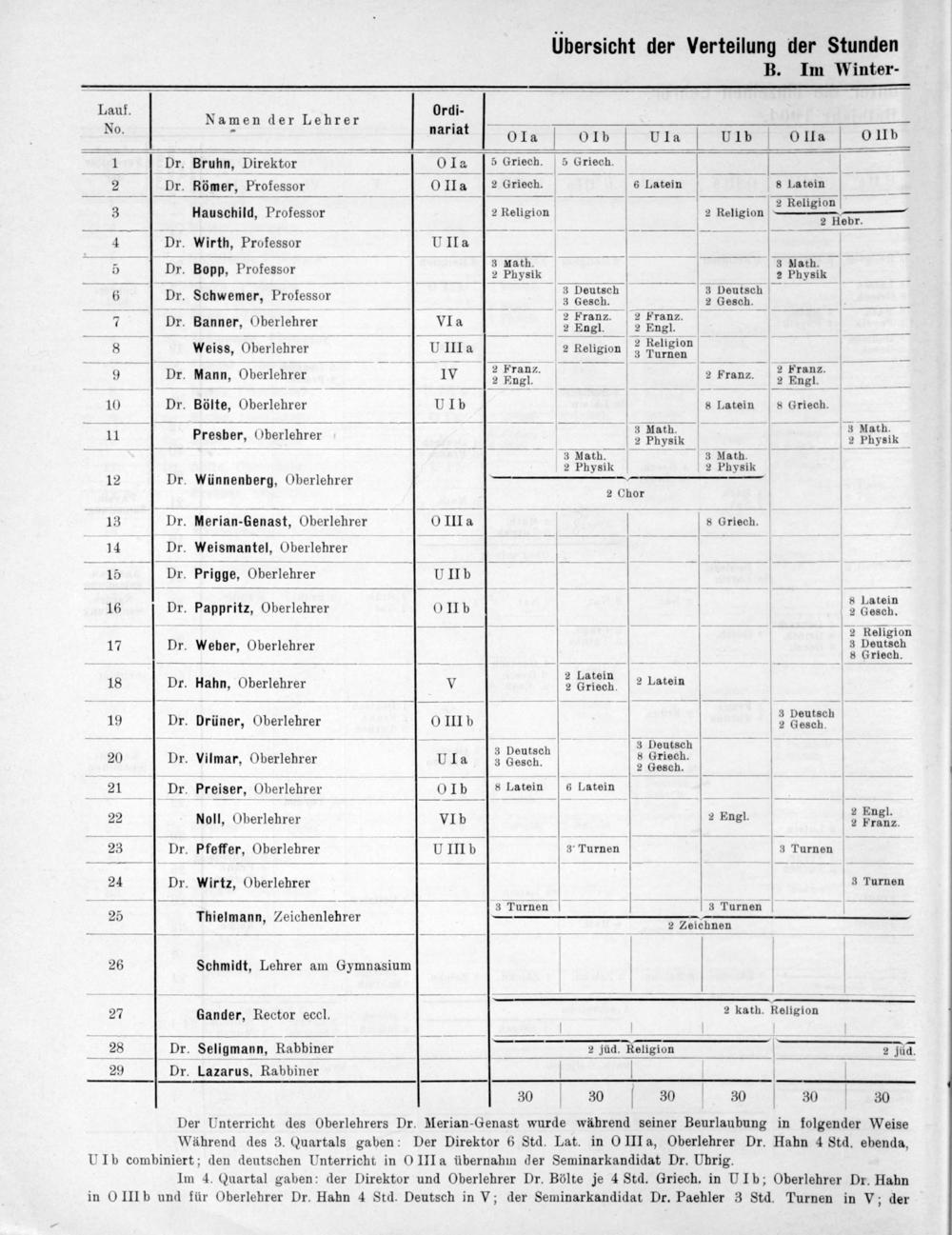 Lauf. i- 10 Namen der Lehrer deat— 2. 2 naria 0Ia 01 b 4* Olla OIb 1 Dr. Brunn, Direktor OIa[riech. 5 Griech. b— 2 Dr. Römer, Professor 0 II a 2 Griech. 6 Latein 8 Latein „ E“ 2 Religion 3 Hauschild, Professor eMauewn 8. 2 Ralielon 3 lebr. 4 r. Wirth, Professor UIIa 4 — Fhh.— Nanh. 5 Dr. Bopp, Professor[² FSais 2 arni 6 Dr. Schwemer, Professor 4 4 3— 4 heutheh lIDr. Banner, Oberlehrer Va ³ Le 21 2 Pran.—— 38 Weiss, Oberlehrer UIIA a nelgion 3 Reneion—— 2 Dr Hanw. Oberehree 12[ZIe.——— 10 Dr. Bölte, Oberlehrer UIb s Latein s Griech. 11 Presber, Oberlehrer 1 Vari V 3 Nathi 5 NC S MNatth. Macch˙. 3 2 Physik 2 Physik 12 Dr. Wünnenberg, Oberlehrer 2 Chor 13 Dr. Merian- genast,„Oberlehrer 0 IIIa s Griech. ——— 14 Dr. Weismantel, Oberlehrer 15 Dr. Prigge, Oberlehrer UIIb V —————— 5— 16 Dr. Pappritz, Oberlehrer 0 II b 5 Iatein 3 kͤ 2 Religion 17 Dr. Weber, Oberlehrer 3 Deutsch . s Griech. 18 Dr. Hahn, Oberlehrer V 3 riech 2 Latein 19 Dr. drüner, Oberlehrer 0 III b 2 Benene — 3 Deutsch 8 5„ 3 Deutscl 48 20 Dr. Vilmar, Oberlehrer UIa 3 Beuche 8 Crieeh. 21 Dr. Preiser, Oberlehrer O Ib[S Latein Latein 22 Noll, Oberlehrer VIb 2 Engl. 2 Pan 23 Dr. Bfeffer, Oberlehrer VUIIHIb ³ Turnen 3 Turnen 24 Dr. Wirtz, Oberlehrer 3 Turnen —— 3 Turm ſ rurnen 4 25 Thielmann, Zeichenlehrer urnen„ee 2. 9 2 Zeichnen 26 Schmidt, Lehrer am Gymnasium 27 Gander, Rector eccl. 2 kath. Religion 28 hDhr. Seligmann, Rabbiner* 2 jüd. Religion— 2 Tiã. 29 Dr. Lazarus, Rabbiner I 360 30 30 36 30 30