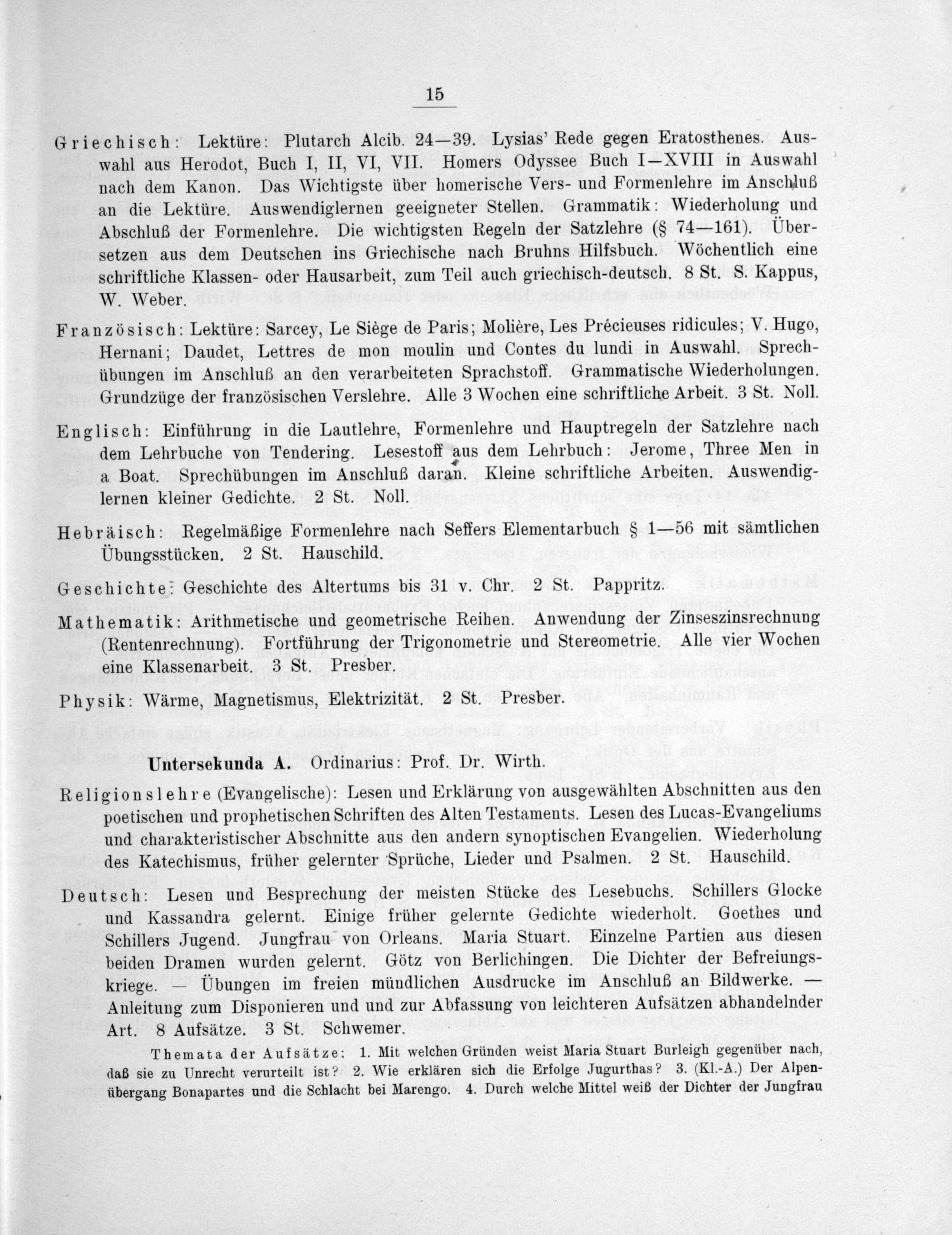 Untersekunda A. Ordinarius: Prof. Dr. Wirth.