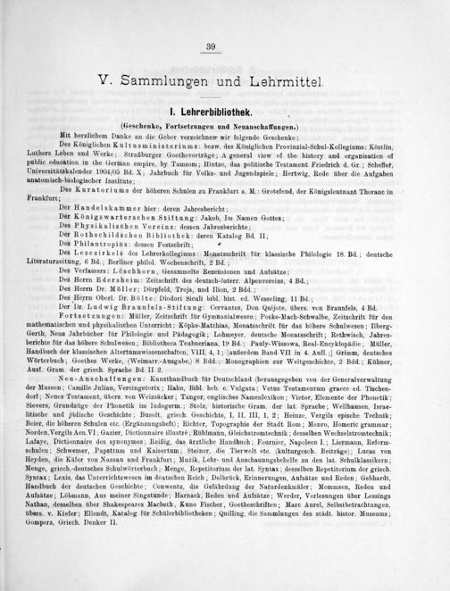 Neu-Anschaffungen: Kunsthandbuch für Deutschland(herausgegeben von der Generalverwaltung der Museen; Camille Julian, Vercingetorix; Hahn, Bibl. heb. c. Vulgata; Vetus Testamentum graece ed. Tischen- dorf; Neues Testament, übers. von Weizsäcker; Tanger, englisches Namenlexikon; Vietor, Elemente der Phonetik; Sievers, Grundzüge der Phonetik im Indogerm.; Stolz, historische Gram. der lat. Sprache; Wellhausen, Israe- litische und jüdische Geschichte; Busolt, griech. Geschichte, I, II, III, 1, 2; Heinze, Vergils epische Technik; Beier, die höheren Schulen etc.(Ergänzungsheft); Richter, Topographie der Stadt Rom; Monro, Homeric grammar; Norden, Vergils Aen. VI; Gazier, Dictionnaire illustré; Rühlmann, Gleichstromtechnik; desselben Wechselstromtechnik; Lafaye, Dictionnaire des synonymes; Reißig, das ärztliche Handbuch; Fournier, Napoleon I.; Liermann, Reform- schulen; Schwemer, Papsttum und Kaisertum; Steiner, die Tierwelt etc.(kulturgesch. Beiträge); Lucas von Heyden, die Käfer von Nassau und Frankfurt; Muzik, Lehr- und Anschauungsbehelfe zu den lat. Schulklassikern; Menge, griech.-deutsches Schulwörterbuch; Menge, Repetitorium der lat. Syntax; desselben Repetitorium der griech. Syntax; Lexis, das Unterrichtswesen im deutschen Reich; Delbrück, Erinnerungen, Aufsätze und Reden; Gebhardt, Handbuch der deutschen Geschichte; Conwentz, die Gefährdung der Naturdenkmäler; Mommsen, Reden und Aufsätze; Löbmann, Aus meiner Singstunde; Harnack, Reden und Aufsätze; Werder, Vorlesungen über Lessings Nathan, desselben über Shakespeares Macbeth, Kuno Fischer, Goetheschriften; Marc Aurel, Selbstbetrachtungen, übers. v. Kiefer; Ellendt, Katalog für Schülerbibliotheken; Quilling, die Sammlungen des städt. histor. Museums; Gomperz, Griech. Denker II.