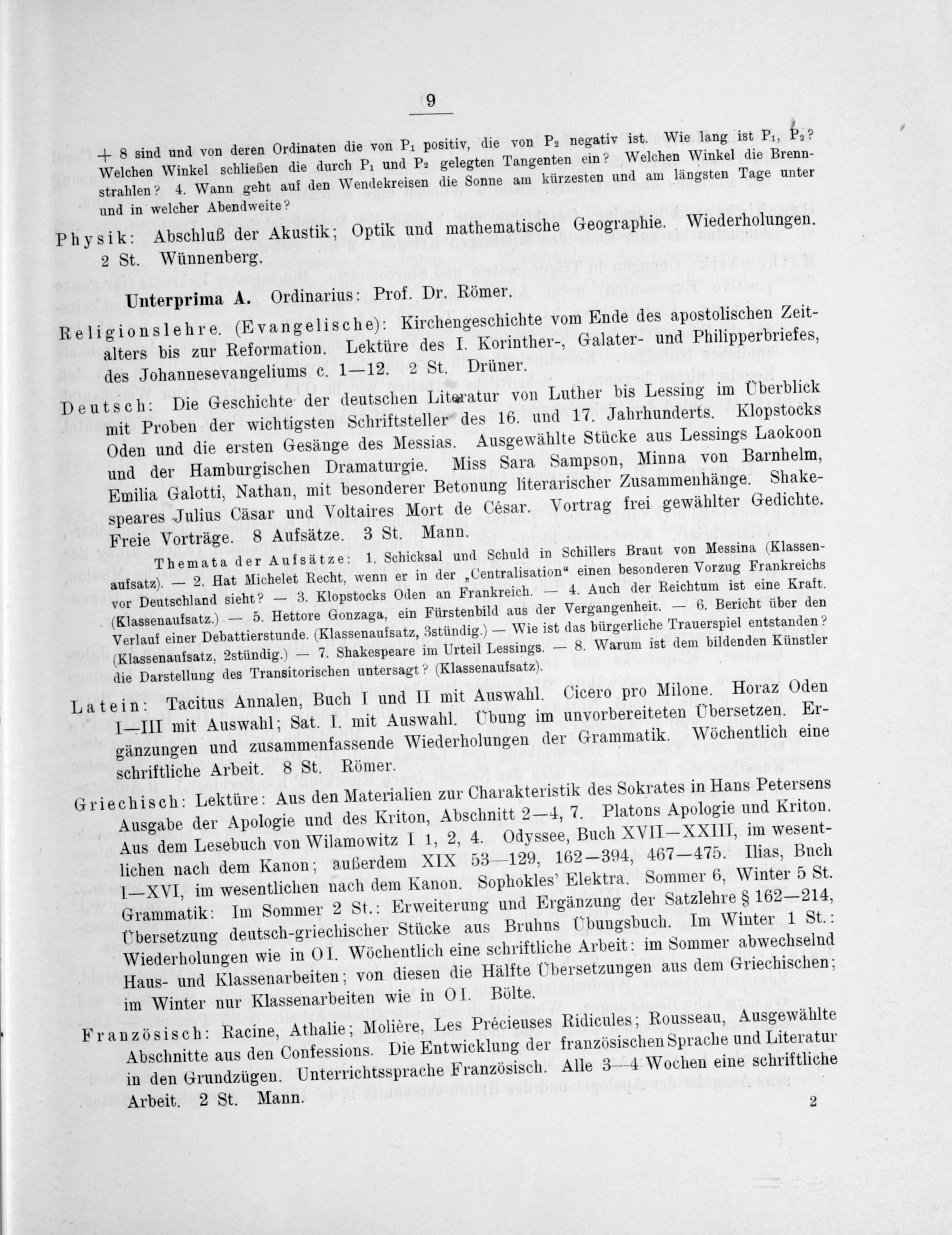Unterprima A. Ordinarius: Prof. Dr. Römer.