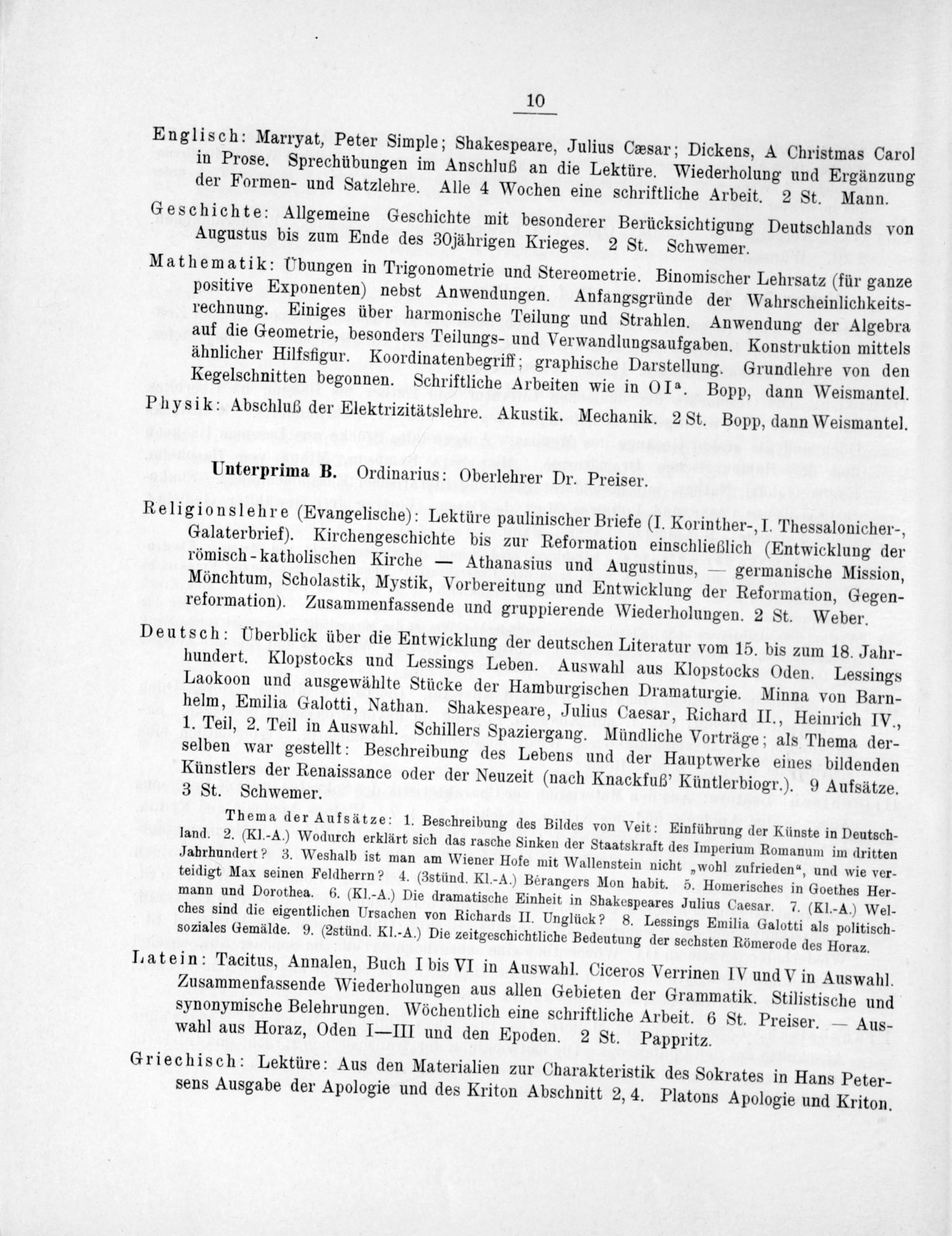 Unterprima B. Ordinarius: Oberlehrer Dr. Preiser.
