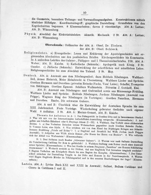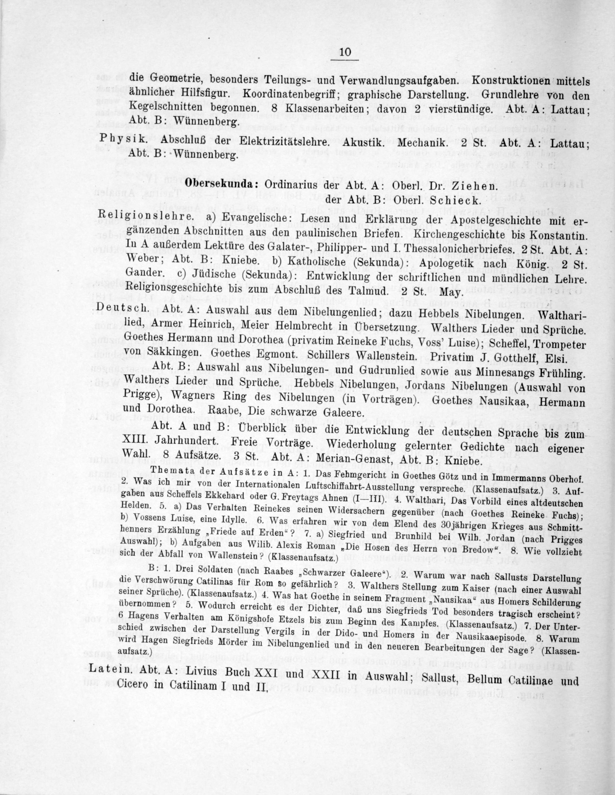 10 die Geometrie, besonders Teilungs- und Verwandlungsaufgaben. Konstruktionen mittels ähnlicher Hilfsfigur. Koordinatenbegriff; graphische Darstellung. Grundlehre von den Kegelschnitten begonnen. 8 Klassenarbeiten; davon 2 vierstündige. Abt. A: Lattau; Abt. B: Wünnenberg.