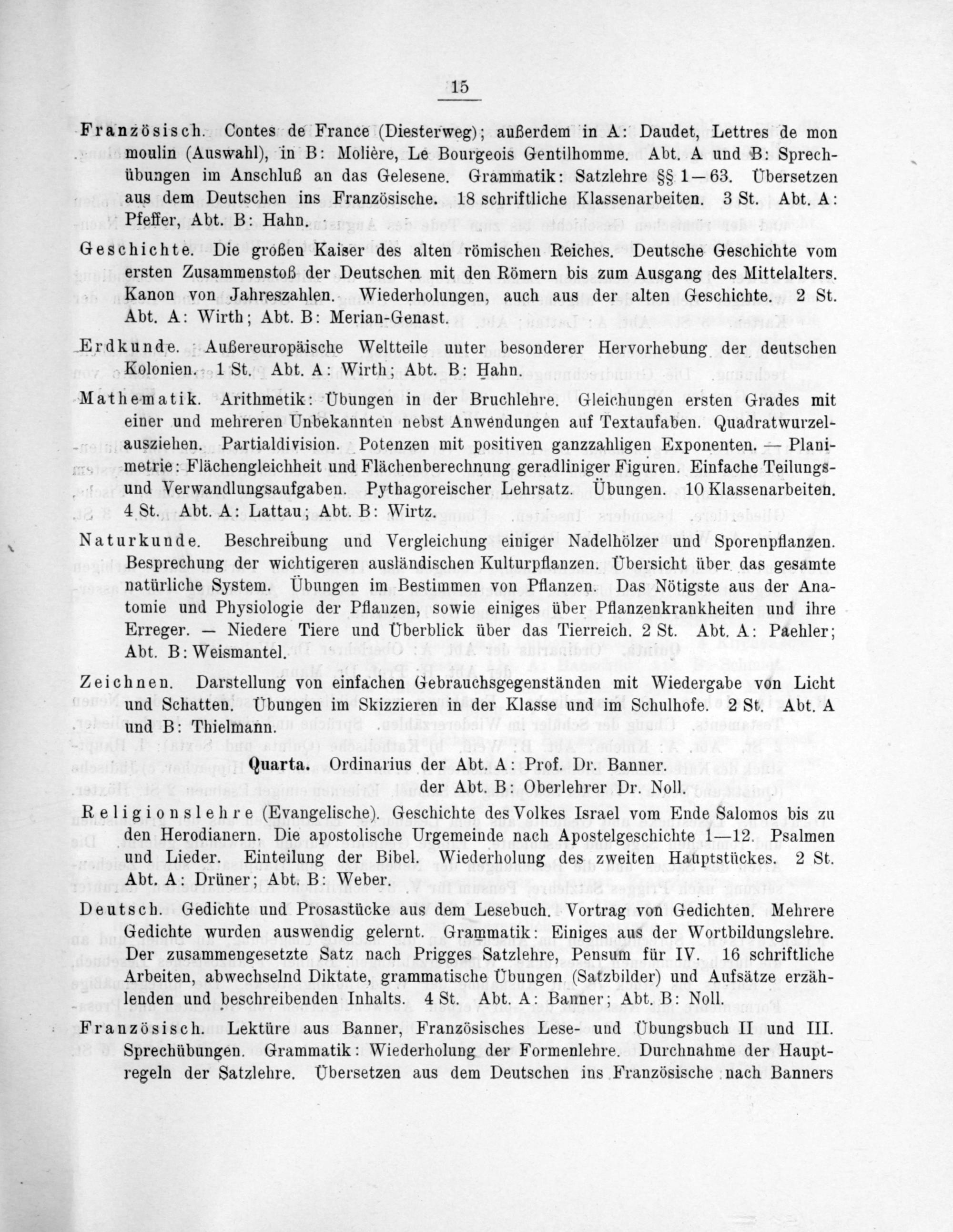 Quarta. Ordinarius der Abt. A: Prof. Dr. Banner. der Abt. B: Oberlehrer Dr. Noll.