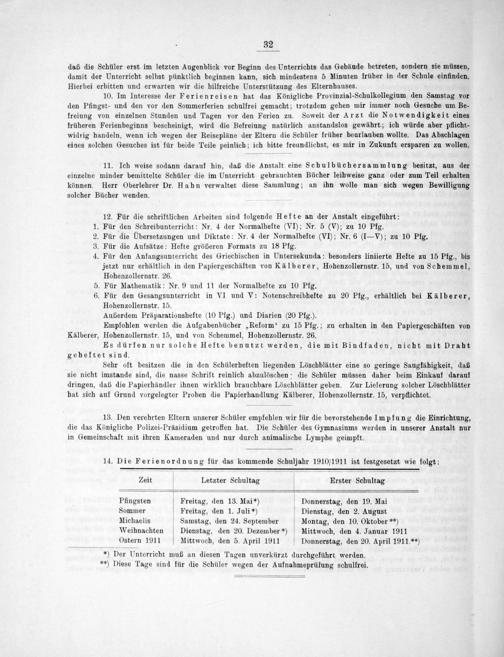 11. Ich weise sodann darauf hin, daß die Anstalt eine Schulbüchersammlung besitzt, aus der einzelne minder bemittelte Schüler die im Unterricht gebrauchten Bücher leihweise ganz oder zum Teil erhalten können. Herr Oberlehrer Dr. Hahn verwaltet diese Sammlung; an ihn wolle man sich wegen Bewilligung solcher Bücher wenden.