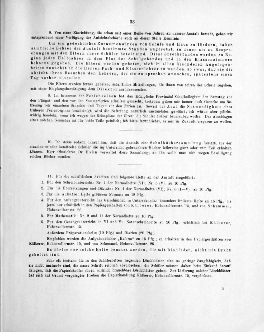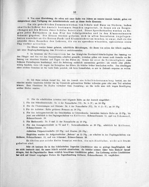 10. Ich weise sodann darauf hin, daß die Anstalt eine Schulbüchersammlung besitzt, aus der einzelne minder bemittelte Schüler die im Unterricht gebrauchten Bücher leihweise ganz oder zum Teil erhalten können. Herr Oberlehrer Dr. Hahn verwaltet diese Sammlung; an ihn wolle man sich wegen Bewilligung solcher Bücher wenden.