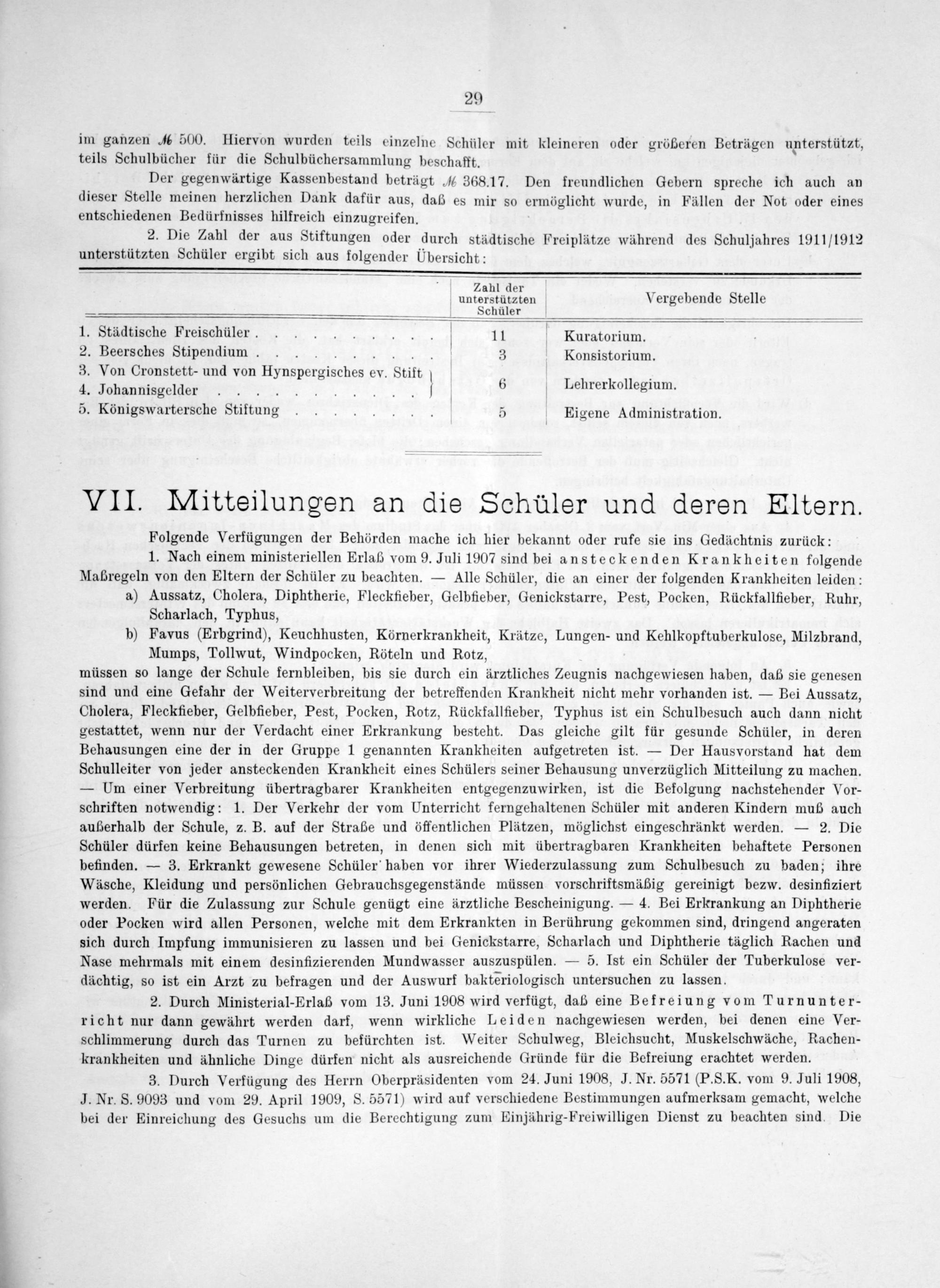 2. Die Zahl der aus Stiftungen oder durch städtische Freiplätze während des Schuljahres 1911/1912 unterstützten Schüler ergibt sich aus folgender übersicht: