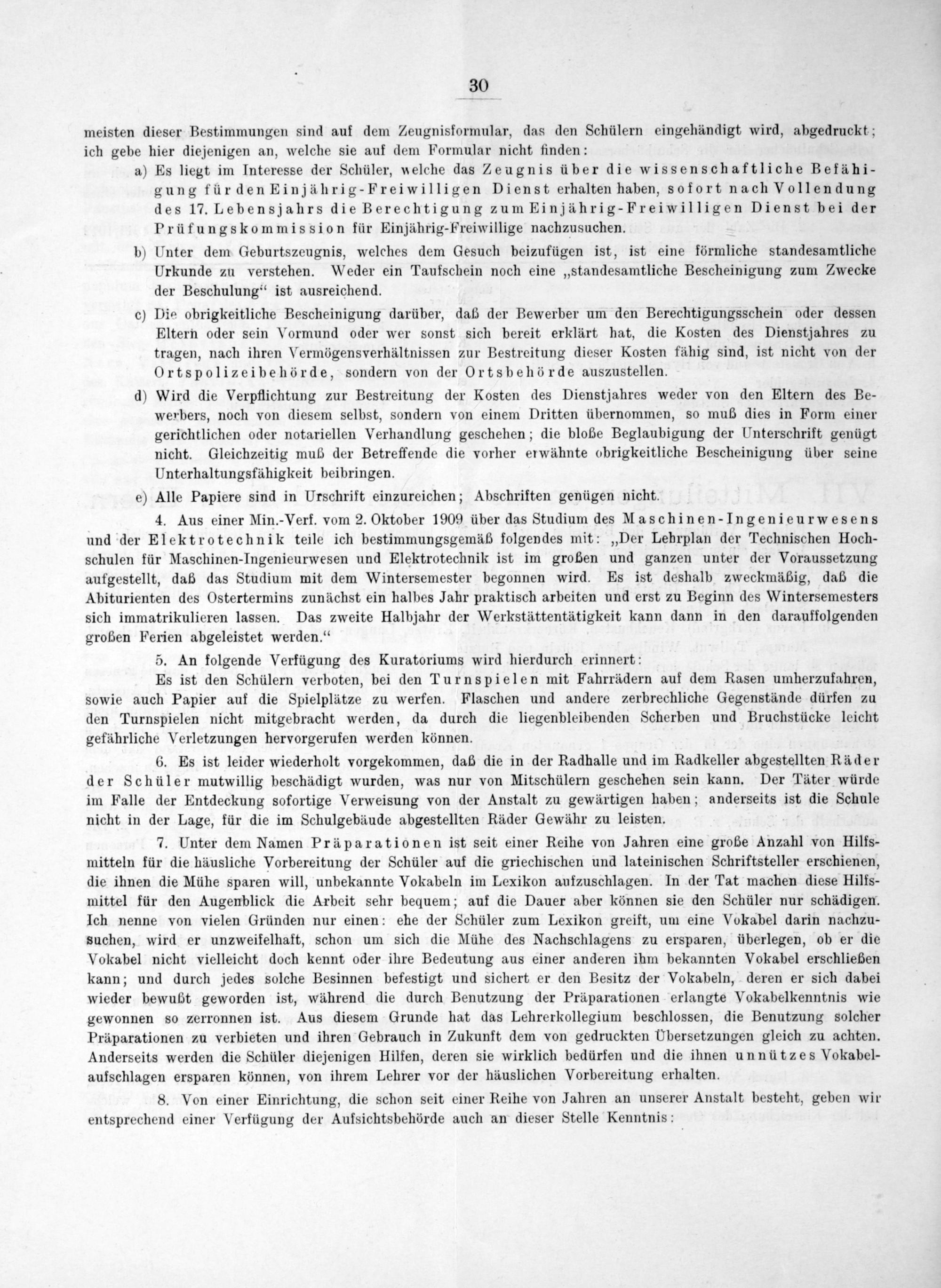 meisten dieser Bestimmungen sind auf dem Zeugnisformular, das den Schülern eingehändigt wird, abgedruckt; ich gebe hier diejenigen an, welche sie auf dem Formular nicht finden: