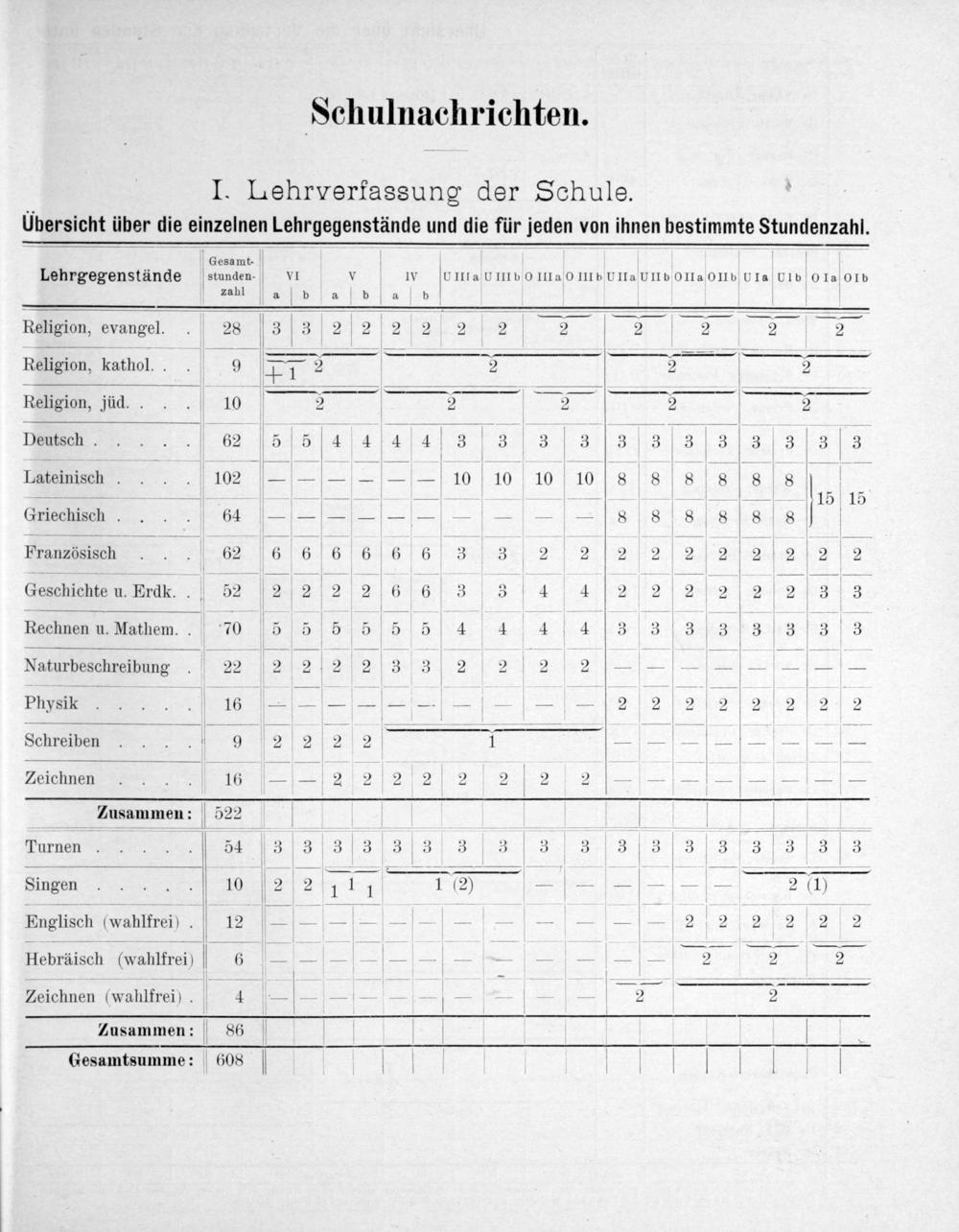 Lehrgegenstände anen V VI v w hern⸗ UIIIbO LIIa O IIIbUIIa UIIb OIIa OIIbUIa UIb OIa OIb zahl a b afbd ab Religion, Lvancel 28 t 3 1 2 2 2 2 2 2 2 7 3 7 Religion, kathol. 9 r 1— 2 4 2 Religion, jüd.. 10 2 2 2— Deutsch. 62 5 5 4 4 4 1:3 3 1 3 313 133 3 3 3 3 Lateinisch. 3 102———— 10 10 10 10 8 8 8 8 8 8 e„ ————— 115 15 Griechisch. 64—————————— 8 8 888 8 Französisch... 62 6 6 6 6 6 6 3 3 2 2 2 2 2 2 2 2 2 2 Geschichte u. Erdk. 52 2 2 2 2 6 6 3 3 4 4 2 2 2 2 V 2 2 3 3 Rechnen n. Mathem.. 70 5 5 5 5 5 5 1 4 4 4 3 3 3 3 V 3 3 3 3 Naturbesclneibuns 1 22 2 2 2 2 3 3 2 2 2 2[——————— Physik 16=——— 2 2 2 2 2[2 2 2 Schreiben 2 9 2 2 2 2———— Zeichnen 4 16—— 2 2 2 2 2 2 2 2——— V———— zZusammen: 522 b 5 Turnen... 1 51 3 3 33 3 333 333 3 3 3 3 3 3 Singen— 10 2 2 111 1 056—— 2d Englisch(wahlfrei) 4 12————-— 2[2 2 2 2 2 Hebraisch(valbltrei) 4——— 2 72 2 Zeichnen(wahlfrei) 5 4——— 2 2 Zusammen: 86 V Gesamtsumme: 608 V V V
