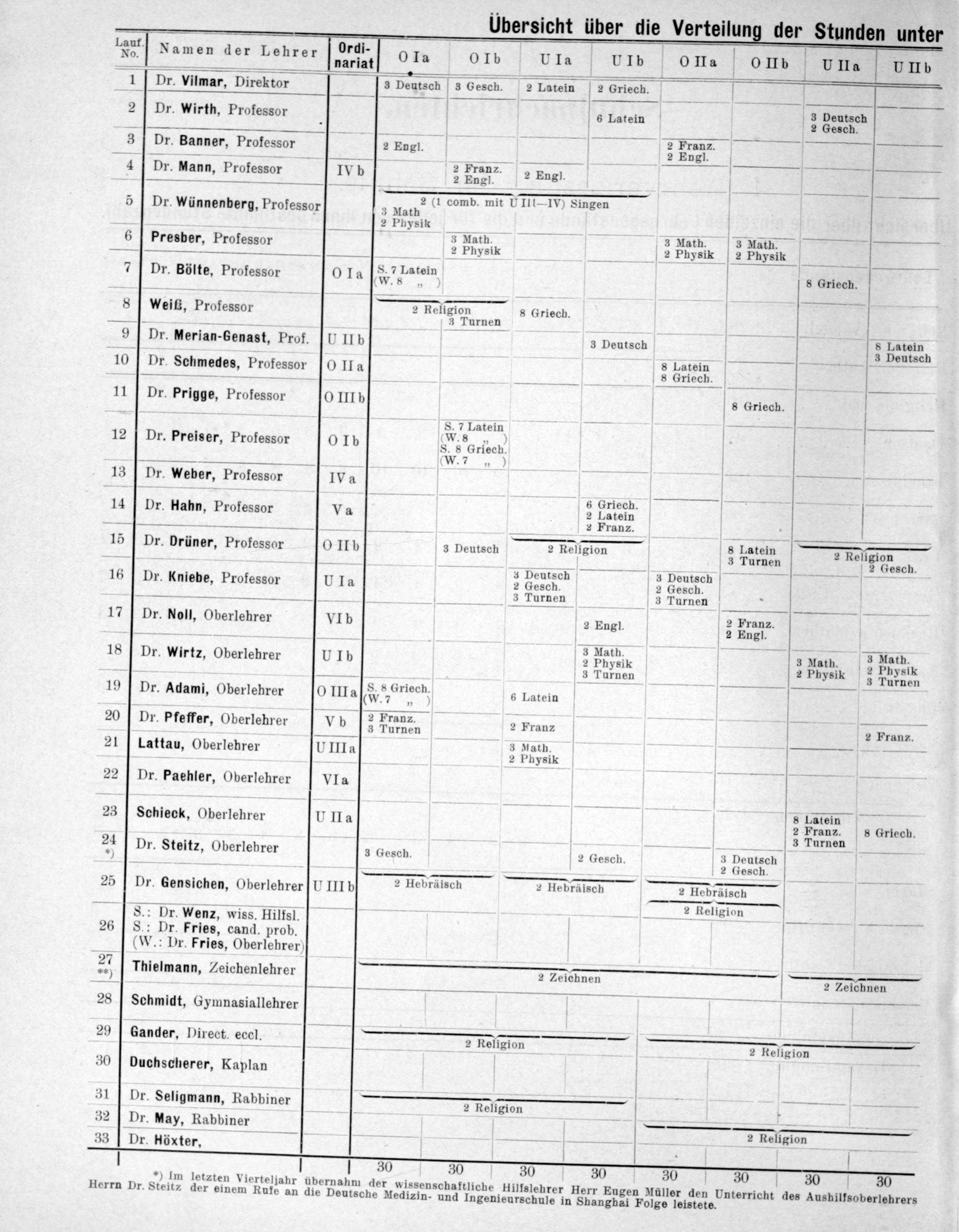Lenf. Namen der Lehrer urr. 0 Ta 0 Ib U Ia U Ib 0 Ila 0 Ib UIIa U IIb ——-——-— Inariat———é————— 1 Dr. Vilmar, Direktor 3 Deutsch 3 Gesch. 2 Latein 2 Griech. 2 4 * ö 3 Deutsch 2 Dr. Wirth, Professor 6 Latein 2 Geuch 3 Sande. P. e— z Franx.— 3 Dr. Banner, Professor 2 Engl. 2 Enel 4 Dr. Mann, Professor IV b 2 Fran⸗. 2 Engl. 5 3 2(1 comb. mit UIII- IV) Singen 5 Dr. Wünnenberg, Professor 3 Mam d1 comb. mi Sung 2 Physik——— — 8 3 Math. 3 Math. 3 Math 6 Presber, Professor 2 Nathi 2 Physik 2 Physik ——+———— 7 Dr. Bölte, Professor 0 Ia(8, 7tein 8 Griech. 8 Weit, Professor 2 Religion 8 Griech. 3 Turnen——— 2„ 5 8 Latein 9 Dr. Merian-Genast, Prof. LI IIb 3 Deutsch 5 Hatein . 8 Latei 10 Dr. Schmedes, Professor 0 IIa 8 Gelein 11 Dr. Prigge, Professor 0 IIIb s Griech. 8.7 Latein.“ 3 12 Dr. Preiser, Professor[O Ib W8. eer) W. 7„)— 13 Dr. Weber, Professor IVa . 6 Griech. 14 Dr. Hahn, Professor Va 2 Latein 2 Franz.— 1.. „. 9. ſgi 8 Latein 1— 15 Dr. Drüner, Professor 0 IIb 3 Deutsch 2 Religion 3 Tatzin, 2 deſie en . 5 ³ Deutschh— 3 Deutsch 16 Dr. Kniebe, Professor U Ia 2 Gesch. 2 Gesch.. 2 3 Turnen 3 Turnen.— 17 Dr. NolHl, Oberlehrer VIb 2 Eugl— 18 Dr. wirtz, Oberleh UIb 1 NeM e an r. Wirtz, erlehrer— 2 Physik 2 Physik 3 Turnen 2 Physik 3 Turnen .————— 19 Dr. Adami, Oberlehrer 0 IIIa(Nrlech. 6 Latein V ————— 20 Dr. Pfeffer, Oberlehrer Vb 2 Frane. 2 Franz 2 Franz. 3 4 77 3 Nath.— 21 Lattau, Oberlebrer UIIIa 4 Pysik V 22 Dr. Paehler, Oberlehrer VIa — 4 V 8 Latein 23 Schieck, Oberlehrer UIHa 2 Franz. s Griech. . 83 Turnen— 24 Dr. Steitz, Oberlebrer 3 Gesch. 2 dGesch. 3 Deutsch *) 2 Gesch. 2 25 Dr. gensichen, Oberlehrer U IIIb 2 Hebräisch 2 Hebräisch 2 Hebräisch ———. 2 Religion 8 S8.: Dr. Wenz, wiss. Hilfsl. 26 S.: Dr. Fries, cand. prob. (W.: Dr. Fries, Oberlehrer) 2, Thielmann, Zeichenlehrer 2 Zeichnen 2 Zeichnen 28 Schmidt, Gymnasiallehrer 29 Gander, Direct, eccl. 2 Religion 2 Religion 30 Duchscherer, Kaplan 31 Dr. Seligmann, Rabbiner 2 Religion 32 Dr. May, Rabbiner 2 Religion 33 PDr. Höxter,* 30 30 30 30 30 30 30 30 *) Im letzten Vierteljahr übernahm der wissenschaftliche Hilfslehrer Herr Eugen Müller den Unterricht des Aushilfsoberlehrers Herrn Dr. Steitz der einem Rufe an die Deutsche Medizin- und Ingenieurschule in Shanghai Folge leistete.