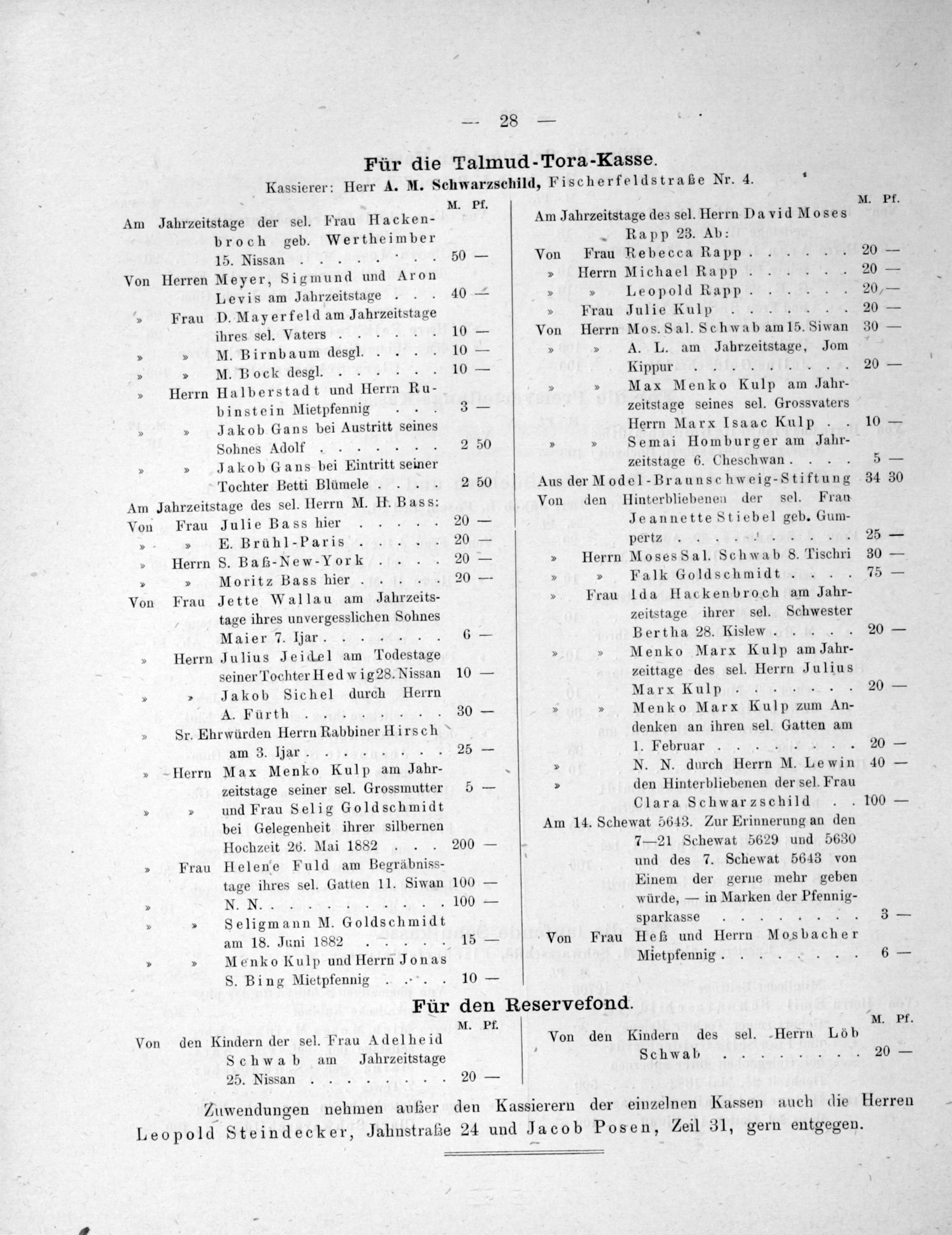 Max Menko Kulp a am Jahr zeitstage seines sel. Grossvaters Herrn Marx Isaac Kulp Semai Homburger am Jahr- zeitstage 6. Cheschwan. Aus der Model-Braunschweig- Stiftung Von den Hinterbliebenen der sel. Frau Jeannette St jebel geb. Gum- pertz MosesSal. Schm ab 8. Tischri Falk Goldschmidt... Lda Hackenbroch am Jahr- zeitstage ihrer sel. Schwester Bertha 28. Kislew. Menko Marx Kulp am Jabr. zeittage des sel. Herrn Julius Marx Kulp. Menko Marx Kuip zum Ar denken an ihren sel. Gatten am 1. Februar. „ N. N. durch Herrn M. Lewin * den Hinterbliebenen der sel. Frau COlara Schwarzschild Am 14. Schewat 5643. Zur Erinnerung an den 7— 21 Schewat 5629 und 5630 und des 7. Schewat 5643 von Einem der gerne mehr geben würde,— in Marken der Pfennig- sparkasse Frau Heß und Herrn AMosbacher Mietpfennig.