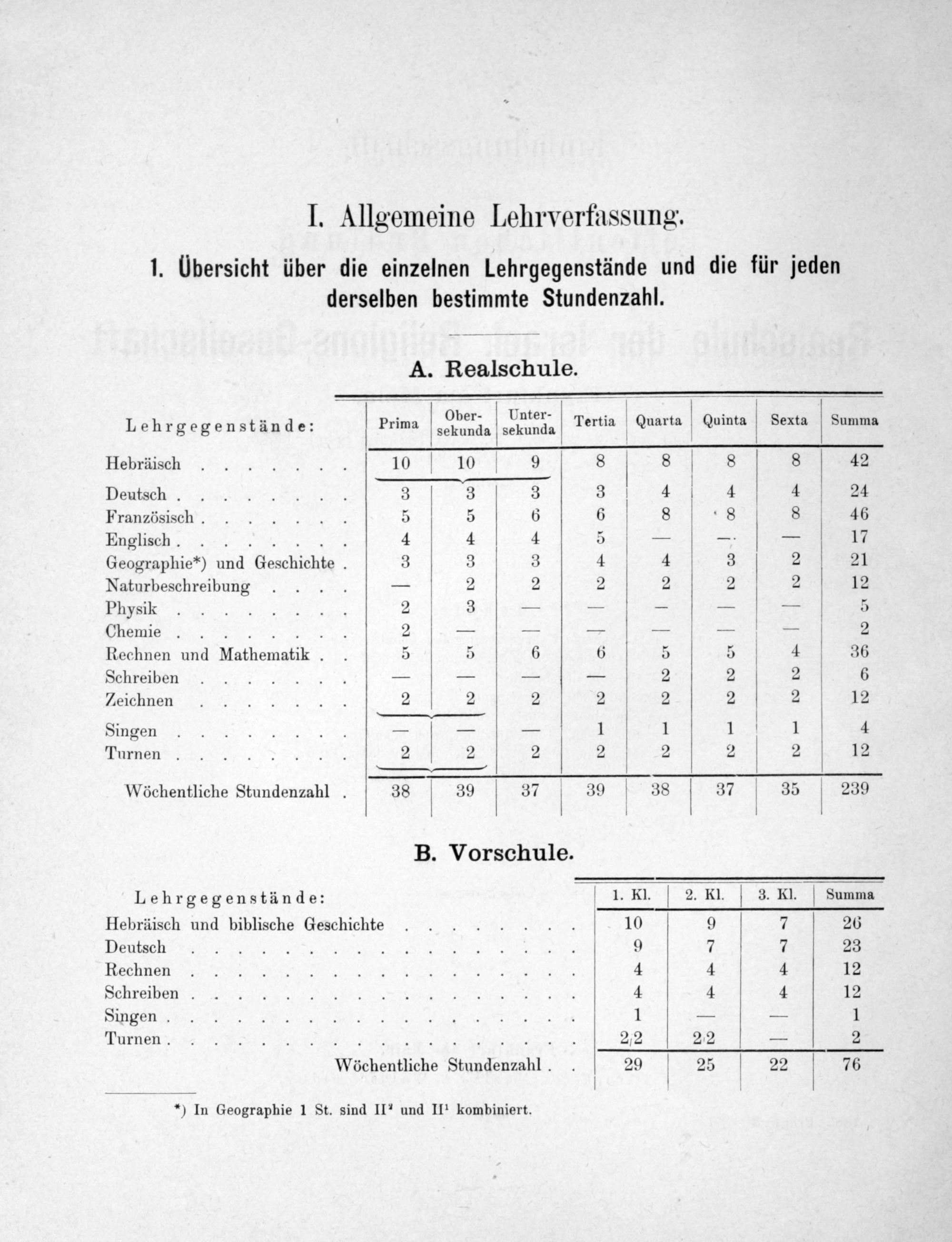 Lehrgegenstände: Prima 8berz, I nkene Tertia b Quarta Quinta Sexta Summa Hebräisch 10 10 9 8 V 81 8 8 42 Deutsch. 3 3 3 3 4 4 4 24 Französisch. 5 5 6 6 8 8 8 46 Englisch...... 4 4 4 5 V——— 17 Geographie*) und Geschichte. 3 3 3 4 4 3 2 21 Naturbeschreibung— 2 2 2 2 2 V 2 12 Physik 2 3————— 5 Chemie... 2—————— 2 Rechnen und Mathematik. 5 5 6 6 5 5 4 36 Schreiben———— 2 2 2 6 Zeichnen 2 2 2 2 2 2 2 V 12
