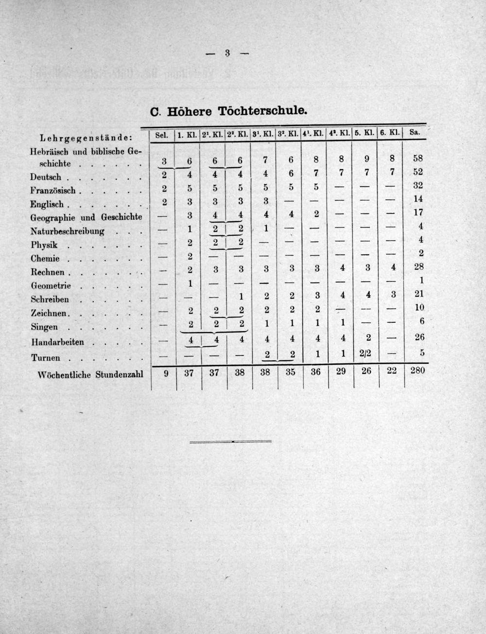 schichte 3 6 6 6 7 6 8 8 8 58 Deutsch. 2 4 4 4 4 6 7 7 7 7 52 Französisch. 2 5 5 5 5 5 5——— 32 Englisch....... 2 3 3 3 3————— 14 Geographie und Geschichte— 3 4 4 4 4 2——— 17 Naturbeschreibung...— 1 2] 2 1————— 4 Pbysik.......— 2 2 2—-———— 4 Chemie......— 2———————— 2 Rechnen........— 2 3 3 3 3 3 4 3 4 28 Geometrie......— 1———————— 1 Schreiben......—.—— 1 2 2 3 4 4 3 21 Zeichnen.......— 2 2 2 2 2 2——— 10 Singen........— 2 2 2 1 1 1 1—— 6 Handarbeiten.....— 4 4 4 4 4 4 4 2— 26 Turnen.......—— V—— 2 2 1 1 2/2— 5
