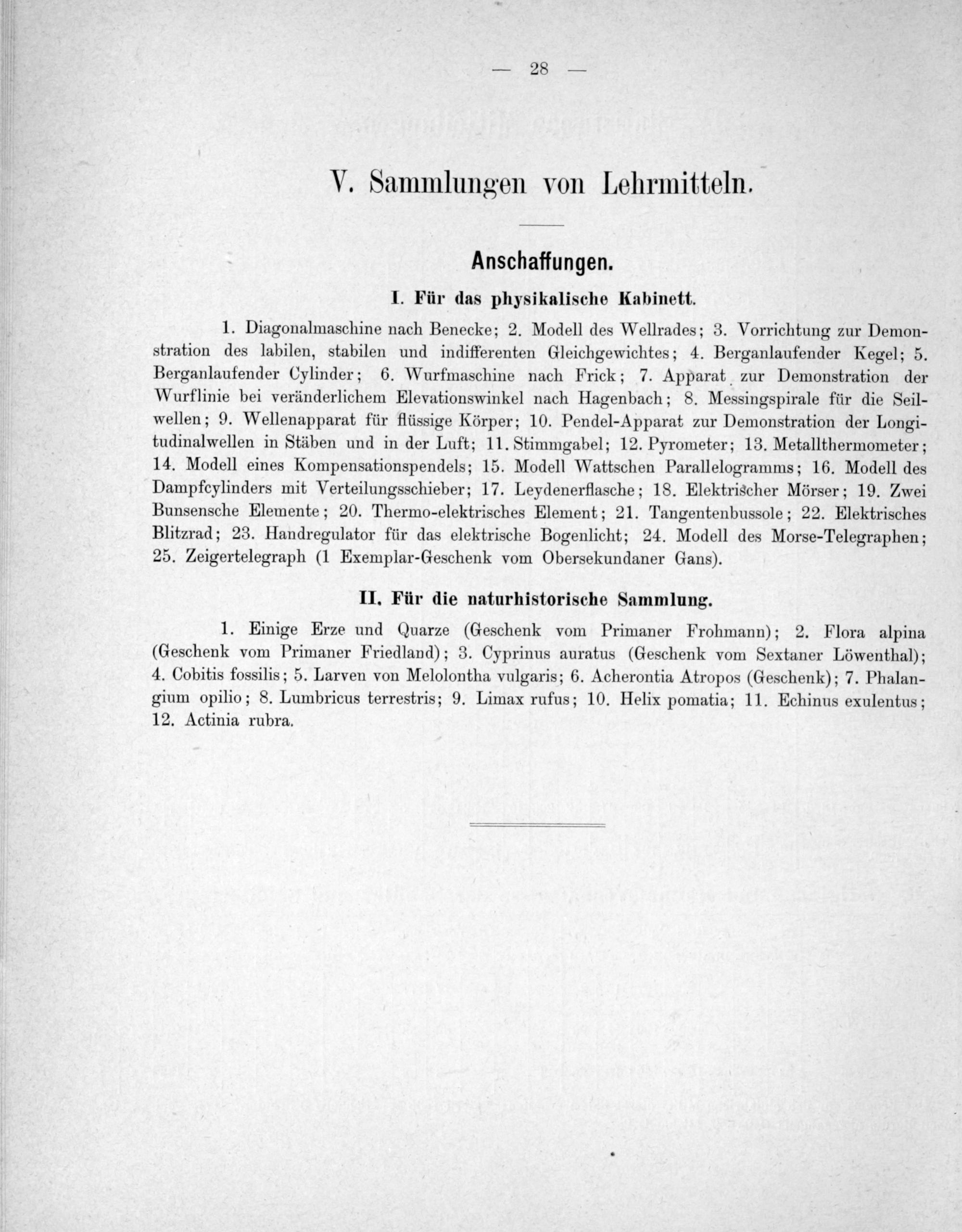 1. Diagonalmaschine nach Benecke; 2. Modell des Wellrades; 3. Vorrichtung zur Demon- stration des labilen, stabilen und indifferenten Gleichgewichtes; 4. Berganlaufender Kegel; 5. Berganlaufender Cylinder; 6. Wurfmaschine nach Frick; 7. Apparat zur Demonstration der Wurflinie bei veränderlichem Elevationswinkel nach Hagenbach; 8. Messingspirale für die Seil- wellen; 9. Wellenapparat für flüssige Körper; 10. Pendel-Apparat zur Demonstration der Longi- tudinalwellen in Stäben und in der Luft; 11. Stimmgabel; 12. Pyrometer; 13. Metallthermometer; 14. Modell eines Kompensationspendels; 15. Modell Wattschen Parallelogramms; 16. Modell des Dampfcylinders mit Verteilungsschieber; 17. Leydenerflasche; 18. Elektrischer Mörser; 19. Zwei Bunsensche Elemente; 20. Thermo-elektrisches Element; 21. Tangentenbussole; 22. Elektrisches Blitzrad; 23. Handregulator für das elektrische Bogenlicht; 24. Modell des Morse-Telegraphen; 25. Zeigertelegraph(1 Exemplar-Geschenk vom Obersekundaner Gans).