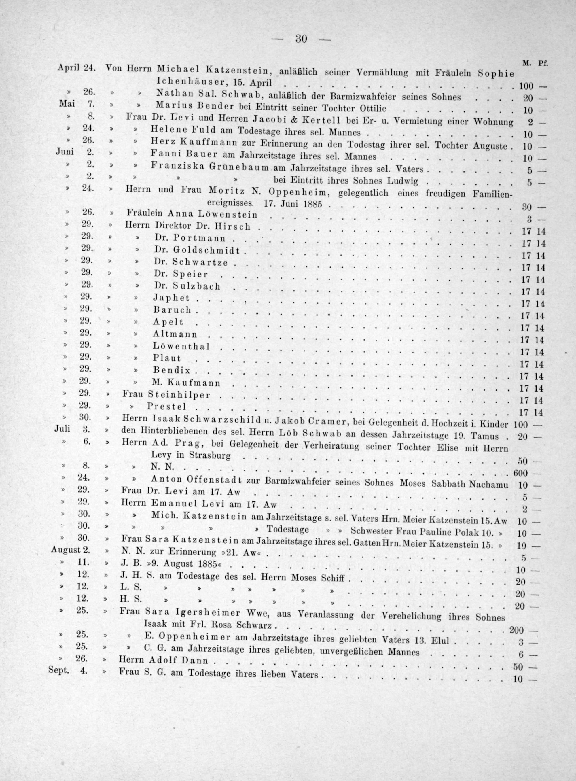 Herrn Isaak Schwarzschild u. Jakob Cramer, bei Gelegenheit d. Hochzeit i. Kinder 100 den Hinterbliebenen des sel. Herrn Löb Schwab an dessen Jahrzeitstage 19. Tamus. 20 Herrn Ad. Prag, bei Gelegenheit der Verheiratung seiner Tochter Elise mit Herrn