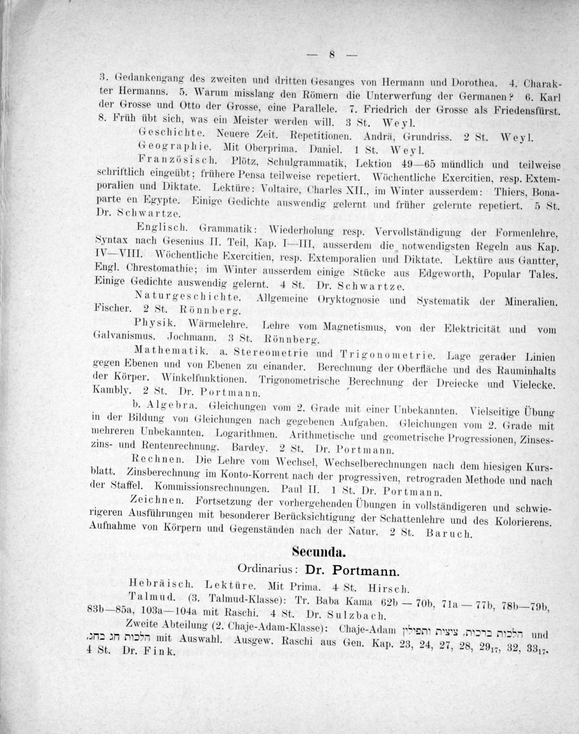 Talmud.(3. Talmud-Klasse): Tr. Baba Kama 62 b— 705, 7la— 77—, 78 b— 79b, 83 b— 85a, 103a— 104a mit Raschi. 4 St. Dr. Sulzbach.