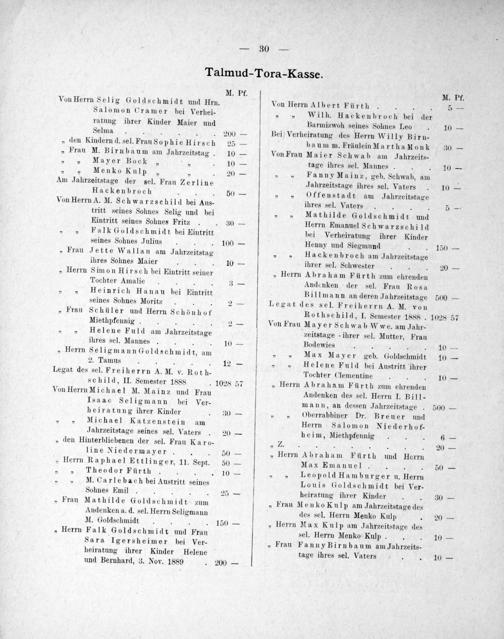 ihrer sel. Schwester.. „ Herrn Abraham Fürth zum ehrenden Andenken der sel. Frau Rosa Billmann an deren Jahrzeitstage Legat des sel. Freiherrn A. M. von Rothschild, I. Semester 1888. Von Frau Mayer Schwab Wwe. am Jahr- zeitstage ihrer sel. Mutter, Frau Bodewies.... Max Mayer geb. Goldschmidt Helene Fuld hei Austritt ihrer Tochter Clementine.. „ Herrn Abraham Fürth zum ehrenden Andenken des sel. Herrn I. Bill-