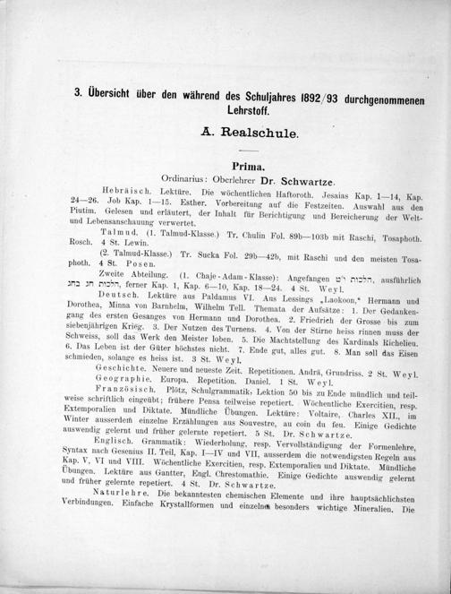 Prima. Ordinarius: Oberlehrer Dr. Schwartze.