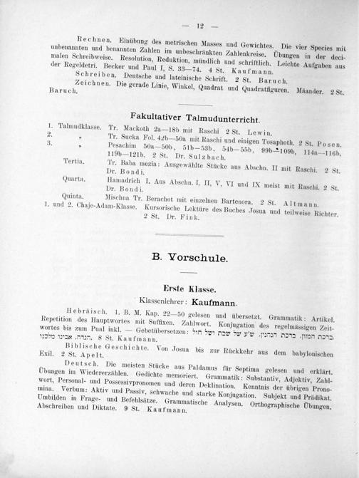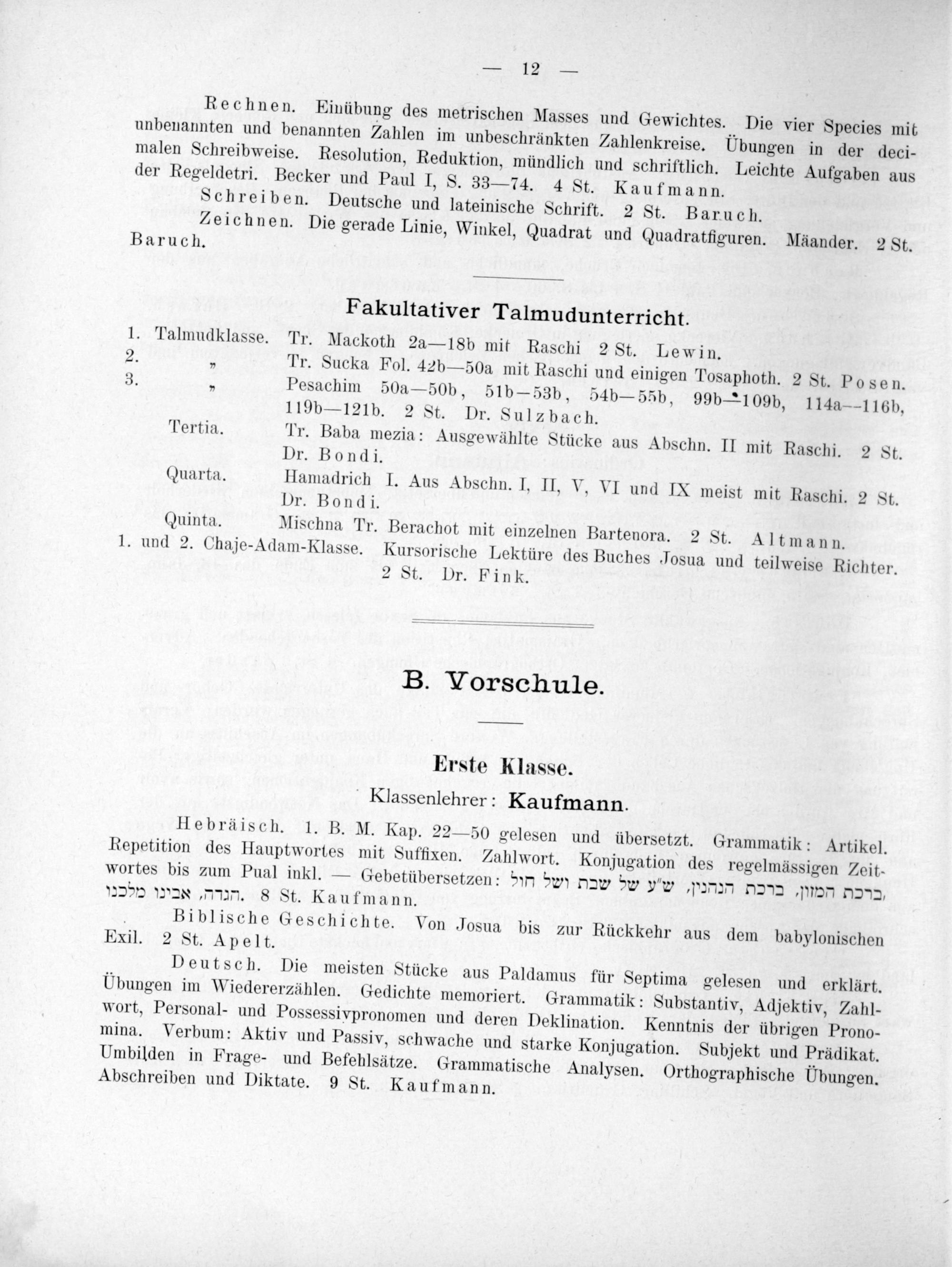 3.„ Pesachim 50 a— 50 b, 51 b— 53 b, 54 b— 55b, 99 b 109b, 114a— 116 b, 119 b— 121b. 2 St. Dr. Sulzbach. Tertia. Tr. Baba mezia: Ausgewählte Stücke aus Abschn. II mit Raschi. 2 St. Dr. Bondi. Quarta. Hamadrich I. Aus Abschn. I. II, V, VI und IX meist mit Raschi. 2 St. Dr. Bondi. Quinta. Mischna Tr. Berachot mit einzelnen Bartenora. 2 St. Altmann.
