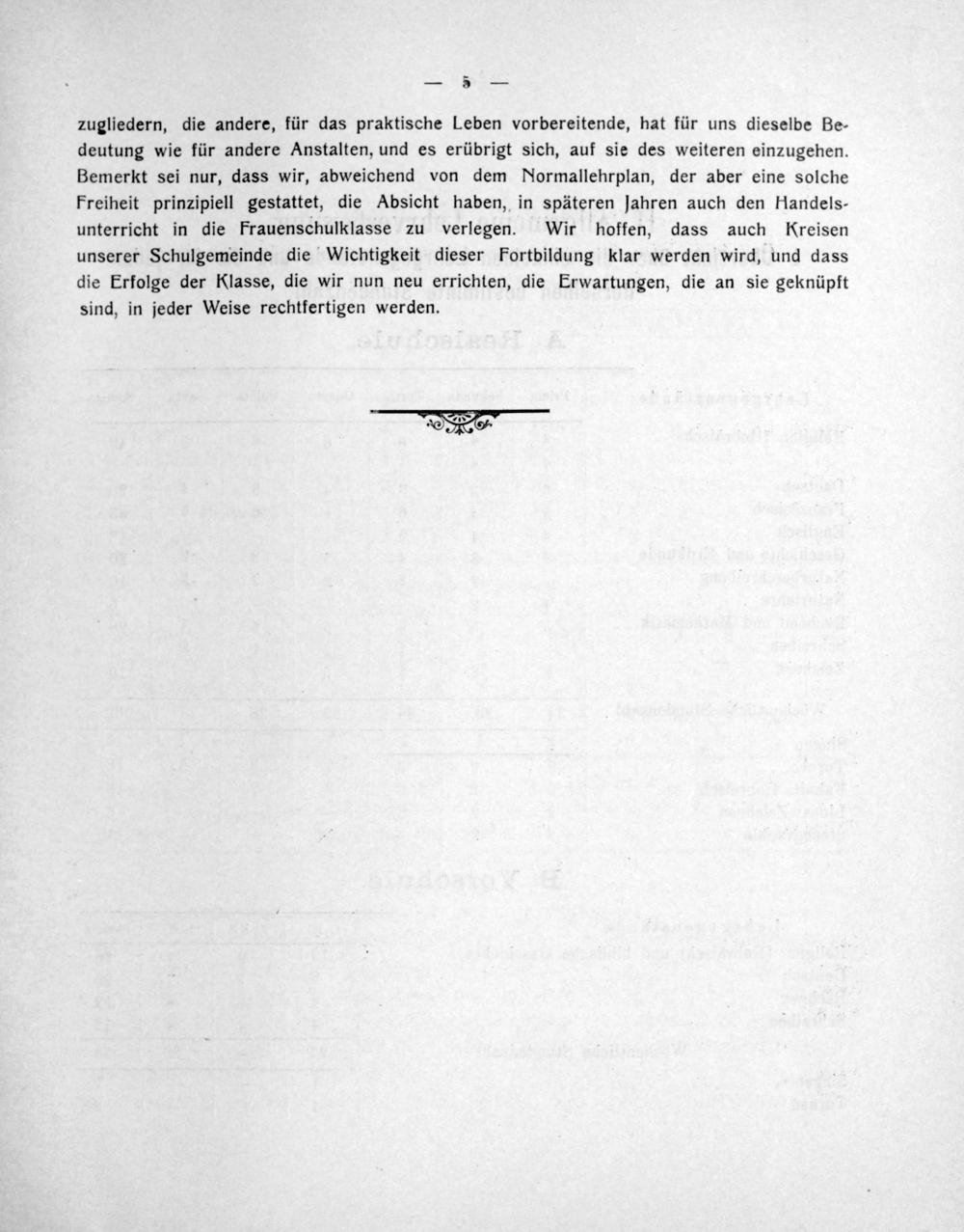 zugliedern, die andere, für das praktische Leben vorbereitende, hat für uns dieselbe Be- deutung wie für andere Anstalten, und es erübrigt sich, auf sie des weiteren einzugehen. Bemerkt sei nur, dass wir, abweichend von dem Normallehrplan, der aber eine solche Freiheit prinzipiell gestattet, die Absicht haben, in späteren jahren auch den Handels- unterricht in die Frauenschulklasse zu verlegen. Wir hoffen, dass auch Kreisen unserer Schulgemeinde die Wichtigkeit dieser Fortbildung klar werden wird, und dass die Erfolge der Klasse, die wir nun neu errichten, die Erwartungen, die an sie geknüpft sind, in jeder Weise rechtfertigen werden.