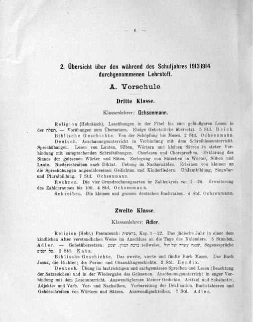 Religion(Hebr.) Pentateuch: e'*2, Kap. 1— 22. Das jüdische Jahr in einer dem kindlichen Alter verständlichen Weise im Anschluss an die Tage des Kalenders. 5 Stunden. Adler.— Gebetübersetzen: ynr„Ihö D*=2 teilweise, bm br dey ev, Segenssprüche d-d y. 2 Std. Katz.