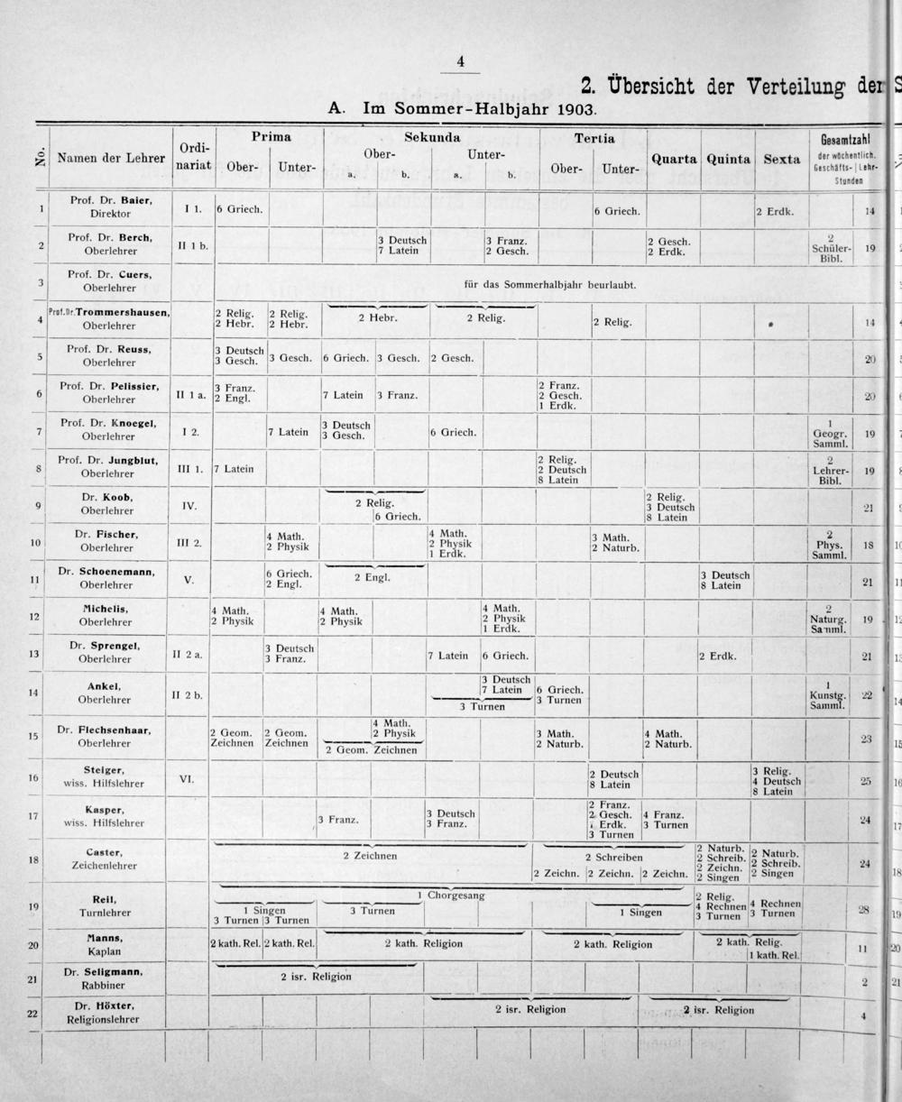1 4 2. Ubersicht der Verteilung derſs A. Im Sommer-Halbjahr 1003. Ordi Prima Sekunda Tertia Gesamtrahl . rdi- 1 S Ober- Unter- i der möchentlich. . uarta in exta. — Namen der Lehrer nariat Ober. Unter- Ober. Unter⸗ 0 Quinta S testhaſts⸗ lene.—— a. b. a. b. — Stunden Prof. Dr. Baier, 1 Direktor I 1.(6 Griech. V 6 Griech. 2 Erdke. 14 ————— Prof. Dr. Berch, 3 Deutsch 3 Franz. 2 Gesch, 2 2 Oberlehrer II 1b. 7 Latein 2 Gesch. 2 Erdl. Schüler. 19 Prof. Dr. Cuers,— 1 2 Oberlehrer V für das Sommerhalbjahr beurlaubt. ſ Prof.Ur Trommershausen, 2 Relig. 2 Relig. i Oberlehrer 2 Hebr. 2 Hebr. 2 Hebr. 2 Renig. 2 Relg. 2„ 14 Prof. Dr. Reuss, Deut; Operiehrer 3 Deutech 3 Gesch. 6 Griech. 3 Gesch. 2 Gesch. V 20 Sberle Prof. Dr. Pelissier, 3 Franz. 2 Franz.. 6 Oberlehrer II 1 a. 2 Engl. 7 Latein 3 Franz. 2 Hesch. 20 ————— T Prof. Dr. Knoegel, B Deutsch 7 1 7 Oberlehrer 12. 7 Latein 3 Gesch. 6 Griech. Geogr. 19 — Samml. pProf. Dr. Jungblut, un I. Latei 2 Reus. h 1 2 19 . atein eutsc ehrer- Oberiehrer 8 Latein Bibl. Dr. Koob,; V 2 Relig. 9 Oberlehrer IV. 2 Kelig. 3 Peutch 21 e Griech. 8 Latein Dr. Fischer, 4 Math 4 Math. 3 Math. 2 10 III 2. 2 E 2 Physik. Phys. 18 Oberlehrer 2 hysik 1 Erdk. 2 Naturb. Samml. —— 3 2 ſ Dr. Schoenemann, v 8 Griech. 2 Engl. 3 Deutsch 11 Oberlehrer. 2 Engl. 8 Latein 21 1. ———— 1—— niichelis, 4 Math 4 Math. V 4 Math. 2.2ö 12 d Phvsi i. 2 Physik Naturg. 19 1 3 Oberlehrer 1 14 2 Physilc 2 Physic 1 EAEA l auf Dr. Sprengel. 3 Deutsch 13 Oberichrer II 2 a. 3 Franz. 7 Latein 6 Oriech. 2 Erdk. 21 14 —————— 2 1— r—————— ſ ſ 3 Deutsch Ankel, 7 Latein 6 COriech 1 14 II 2 b.— 4 Kunstg. 22. Oberlehrer—4 Tucnen Turnen Samml. 14 1 Math— 15 Dr. Plechsenhaar, 2 Geom. 2 Geom. 2 Physik 3 Math. 4 Math. 23 Oberlehrer Zeichnen Zeichhn————— 2 Naturb. 2 Naturb.— 15 2 Geom. Zeichnen Steiger, 2 Deutsch 3 Relig. 16 wiss. Hilfslehrer VI. V V 8 Latein 4 Peussch 235 —— 1 1 8 Latein 2 Franz. 17 Kasper, 3 F 3 Deutsch 2 Gesch. 4 Franz. 24 wiss. Hilfslehrer 3 Iranz. 3 Franz. Erdk. 3 Turnen 17 —— 1J1 3 Turnen 2 Naturb. Caster, 2 ZLeichnen 2 Schreiben 2 Schreib. 2 Naturb.. 18 Zeichenlehrer 2 Zeichn 2 Schreib. 24 1 2 Zeichn. 2 Zeichn. 2 Zeichn. 2 Singen 2 Singen 18 4 1 Chorgesang 2 Relig. Reil,—O—O—C—C— 4 Rechnen 19 1 Singen 3 Turnen 1 Singen 4 Recſmen 3 Turnen 28 19 Turmlehrer 3 Turnen 3 Turnen 2 3 Turnen 20 Nanns, 2 kath. Rel. 2 kath. Rel. 2 kath. Religion 2 kath. Religion 2 kath. Relig. 1 e Kaplan 1 kath. Rel. Dr. Seligmann, 2 isr. Religion 1 21 Rabbiner Ei— 2 A 22 Dr. Höxter, 2 isr. Religion 2 isr. Religion 4 Religionslehrer— b