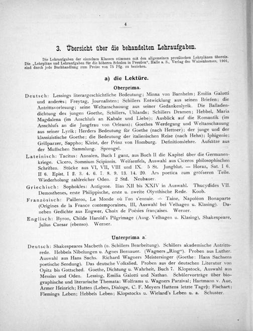 Deutsch: Lessings literargeschichtliche Bedeutung; Minna von Barnhelm; Emilia Galotti und anderes; Freytag, Journalisten; Schillers Entwicklung aus seinen Briefen; die Antrittsvorlesung; seine Weltanschauung aus seiner Gedankenlyrik. Die Balladen- dichtung des jungen Goethe, Schillers, Uhlands; Schillers Dramen; Hebbel, Maria Magdalena(im Anschluſs an Kabale und Liebe); Ausblick auf die Romantik(im Anschlufs an die Jungfrau von Orleans); Goethes Werdegang und Weltanschauung aus seiner Lyrik; Herders Bedeutung für Goethe(nach Hettner); der junge und der klassizistische Goethe; die Bedeutung der italienischen Reise(nach Hehn); Iphigenie; Grillparzer, Sappho; Kleist, der Prinz von Homburg. Definitionslehre. Aufsätze aus der Muffschen Sammlung. Sprengel.