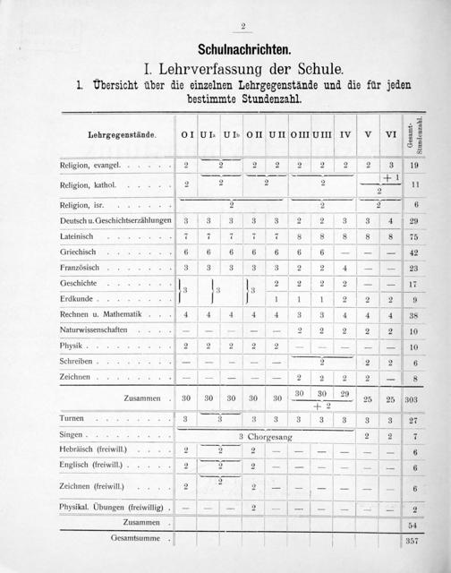 ö V. 8 Lehrgegenstände. OI UI-⸗ UEOn UIOII IV V VI 2 3½ ‿ S 5 ————— 3 V— 5 Religion, evangel. 2 2 2 2 2 2 2 3 19 ——,4— 9 3[+ 1 3 Religion, kathol. 2 2 2 V 2—,— 11 Religion, isr. 2 2 2 6 .——————— Deutsch u. Geschichtserzählungen 3 3 3 3 3 2 2 3 3 4 29 Lateinisch 71 7 7 1 1 sSſsSſsſsſs 75 Griechisch 6 6 6 6 6 6 6——— 42 Französisch 3 ſ 3 ſ3 3[3 2 2[4—— 23 Geschicht 8 8 2 2—— 17 GCesc ic e. Is 1. l. 2 2² 4 V 17 Erdkunde. 111 122 2 ——————————— Rechnen u. Mathematik. 4 4 4 4 4 3 3[4 4 4 38 ——————— Naturwissenschaften————— 2 2 2 2 2 10 Pnysk.. 2 21 2 2[2——=[———IN10 Schreiben.——-——— 5 2 2 E 1 Zeichnen.— V———— 2— 2 2 2— 3 2 m Zusammen 30 30 30 30 30 30.1 30 1.29 25 25 303 ————ES Turnen I32ſ1 3[3ſ3ſ23ſ3ſ3[3 ſa ——— ͤ V„ Singen. 3 Chorgesang 2 2 7 Hebräisch(freiwilll.).... 2 2=———— 3 Englisch(freiwill.).. 2 2— 2—-————= 6 ——— 4 1————— : 1. 2 5— V Zeichnen(freiwill.) 2 I 2—— 1— 6 .* ſſſͤͤ Physikal. Ubungen(freiwillig) A— V— V— 2— V——— V— 2 Zusamme* V ſ men b V 3 54 Gesamtsumme V 357