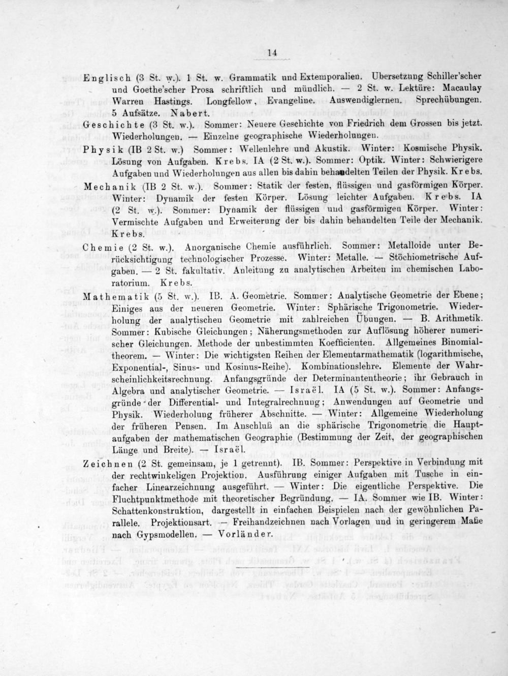 Mechanik(IB 2 St. w.). Sommer: Statik der festen, flüssigen und gasförmigen Körper. Winter: Dynamik der festen Körper. Lösung leichter Aufgaben. Krebs. IA (2 St. w.). Sommer: Dynamik der flüssigen und gasförmigen Körper. Winter: Vermischte Aufgaben und Erweiterung der bis dahin behandelten Teile der Mechanik.
