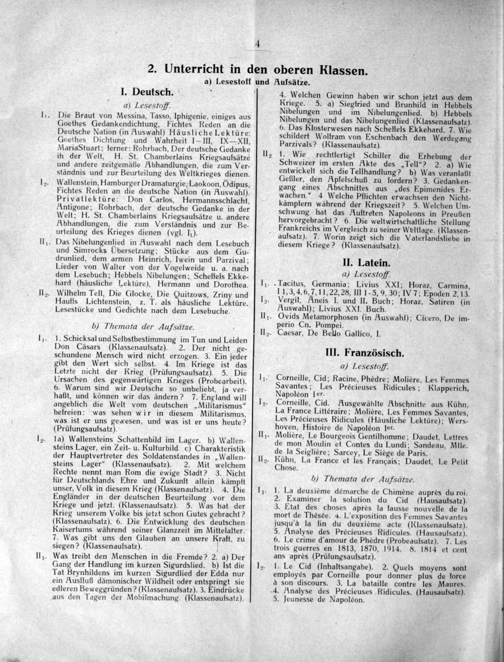 Wallenstein, Hamburger Dramaturgie, Laokoon, Odipus, Fichtes Reden an die deutsche Nation(in Auswahl). Privatlektüre: Don Carlos, Hermannsschlacht, Antigone; Rohrbach, der deutsche Gedanke in der Welt; H. St. Chamberlains Kriegsaufsätze u. andere Abhandlungen, die zum Verständnis und zur Be- urteilung des Krieges dienen(vgl. Ii).