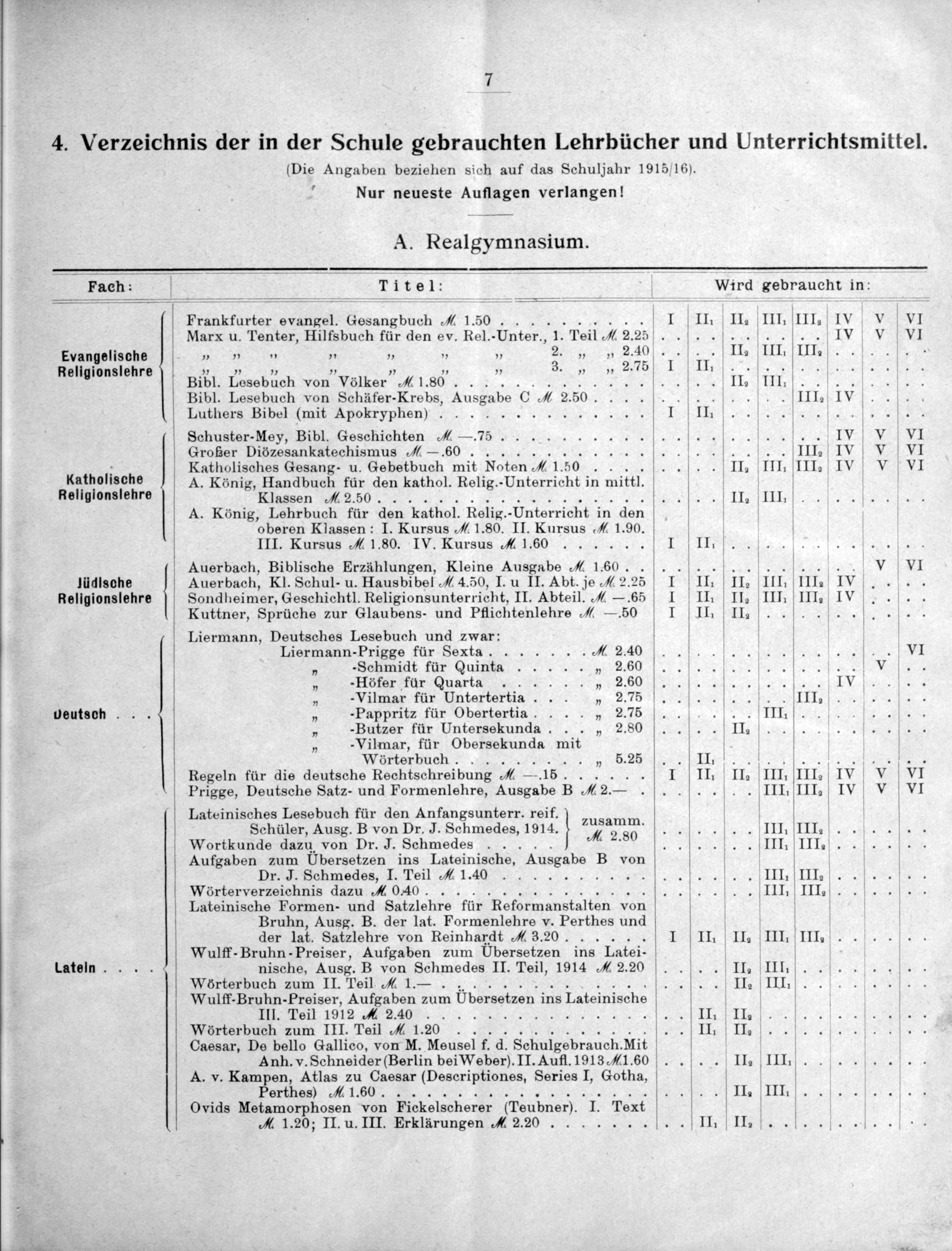 4. Verzeichnis der in der Schule gebrauchten Lehrbücher und Unterrichtsmittel. (Die Angaben beziehen sich auf das Schuljahr 1915/16).