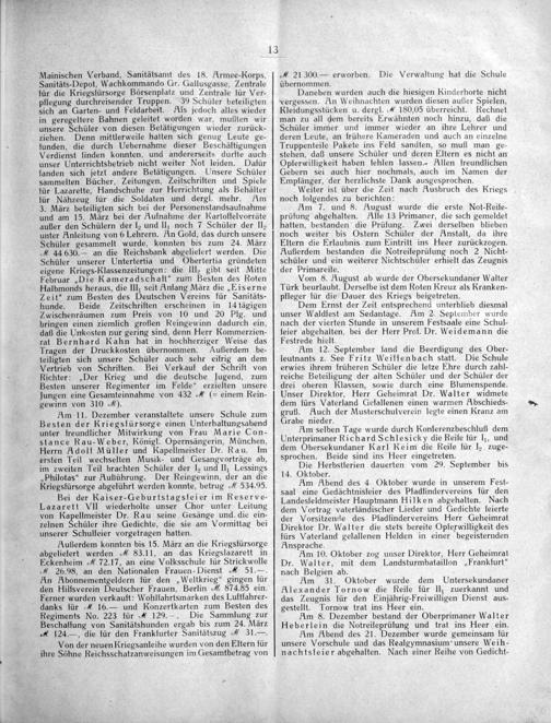 Dem Ernst der Zeit entsprechend unterblieb diesmal unser Waldſest am Sedantage. Am 2. September wurde nach der vierten Stunde in unserem Festsaale eine Schul- ſeier abgehalten, bei der Herr Prof. Dr. Weidemann die Festrede hielt.