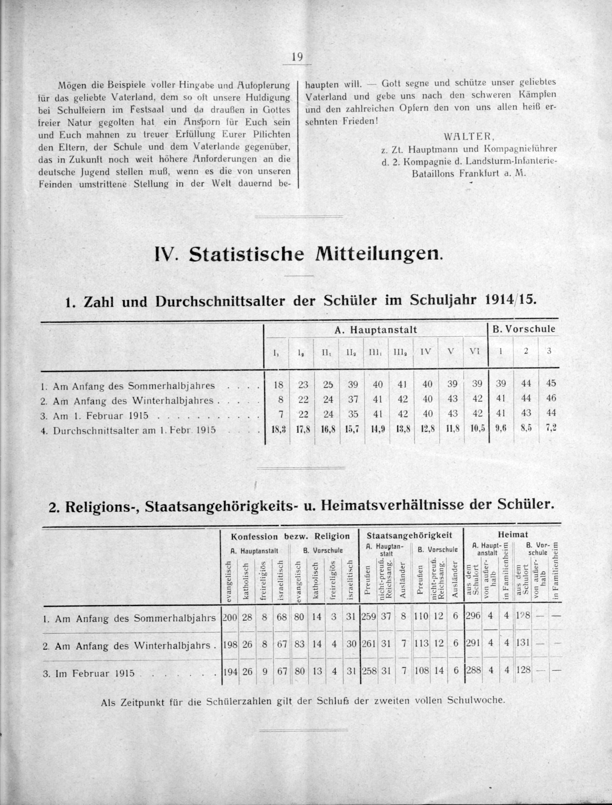 1. Zahl und Durchschnittsalter der Schüler im Schuljahr 1914/15.