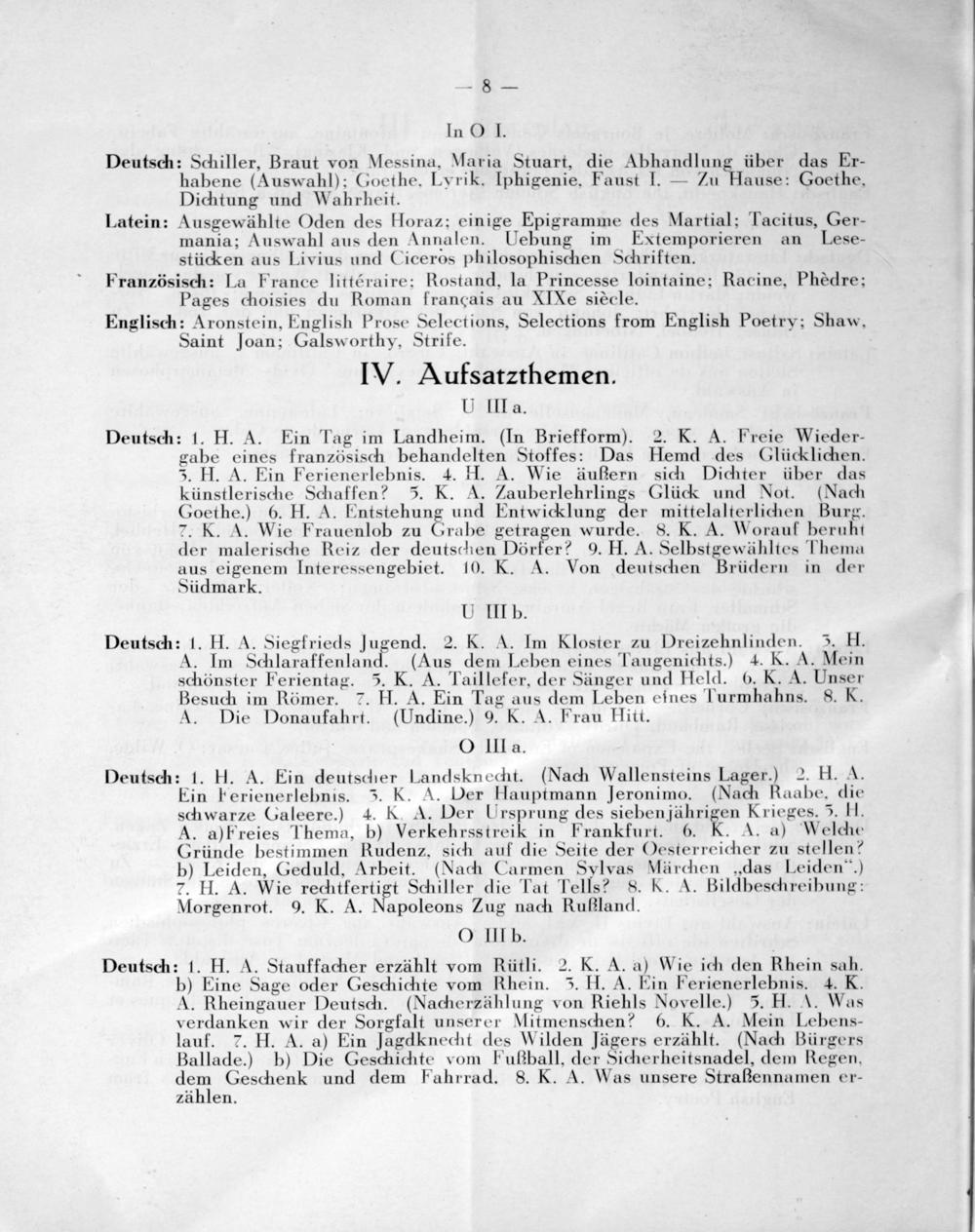 Deutsch: 1. H. A. Siegfrieds Jugend. 2. K. A. Im Kloster zu Dreizehnlinden. 5. H. A. Im Schlaraffenland.(Aus dem Leben eines Taugenichts.) 4. K. A. Mein schönster Ferientag. 5. K. A. Taillefer, der Sänger und Held. 6. X. A. Unser