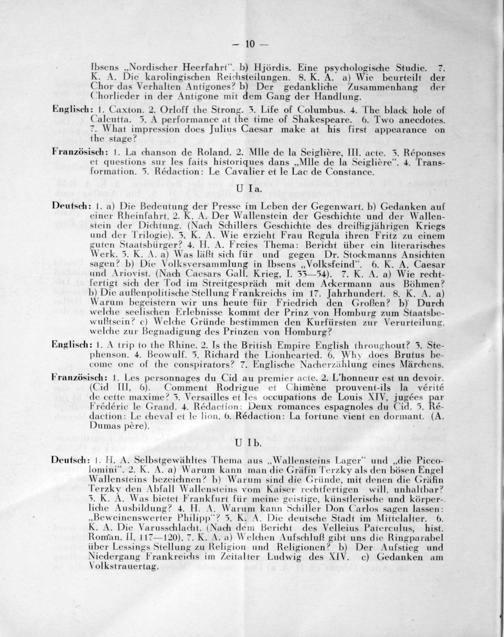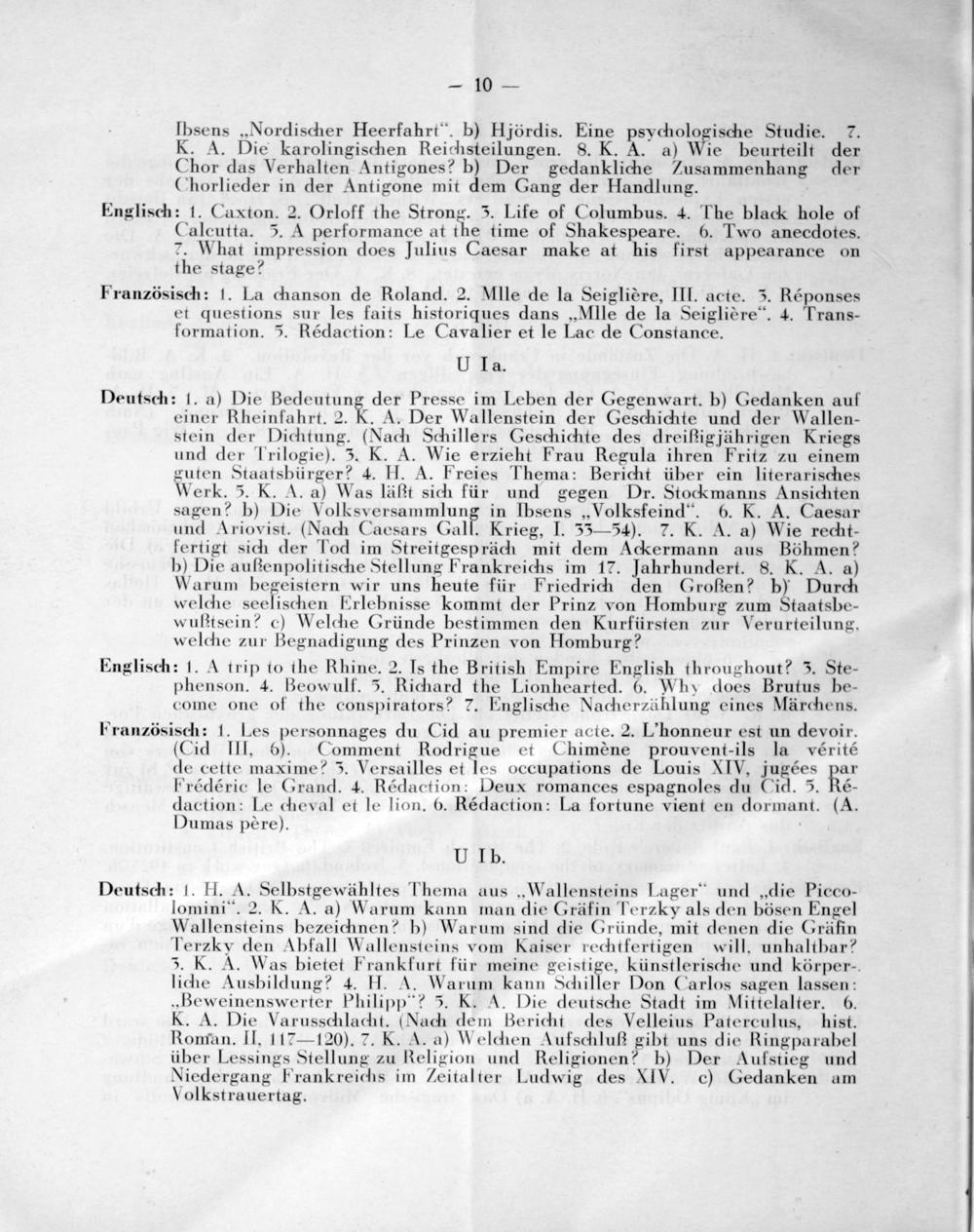 Deutsch: 1. a) Die Bedeutung der Presse im Leben der Gegenwart. b) Gedanken auf einer Rheinfahrt. 2. K. A. Der Wallenstein der Geschichte und der Wallen- stein der Dichtung.(Nach Schillers Geschichte des dreißigjährigen Kriegs und der Trilogie). 5. K. A. Wie erzieht Frau Regula ihren Fritz zu einem guten Staatsbürger? 4. HI. A. Freies Thema: Bericht über ein literarisches Werk. 5. K. A. a) Was läßt sich für und gegen Dr. Stockmanns Ansichten sagen? b) Die Volksversammlung in Ibsens„Volksfeind“. 6. K. A. Caesar und Ariovist.(Nach Caesars Gall. Krieg, I. 55— 54). 7. K. A. a) Wie recht- fertigt sich der Tod im Streitgespräch mit dem Ackermann aus Böhmen? b) Die aufßienpolitische Stellung Frankreichs im 17. Jahrhundert. S. K. A. a) Warum begeistern wir uns heute für Friedrich den Großen? b) Durch welche scelischen Erlebnisse kommt der Prinz von Homburg zum Staatsbe- wußtsein? c) Welche Gründe bestimmen den Kurfürsten zur Verurteilung. welche zur Begnadigung des Prinzen von Homburg?