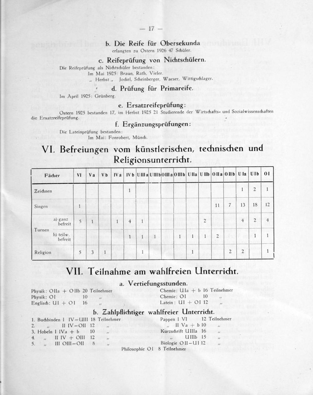 Physik: Ol 10 7 Chemie: Ol 10„ Englisch: UI+ OI 16 2 Latein: UII+ O1 12„ b. Zahlpflichtiger wahlfreier Unterricht. 1. Buchbinden I IV- UIII 18 Teilnehmer Pappen I VI 12 Teilnehmer 2.„ IIIV-Oll 12„„ II Va † b 10„ 3. Hobeln I IVa+ b 10 5 Kurzschrift UIIIa 16„ 4.„ II IV+ Olll 12„. UIllb 15„ 5.„ III OlIl-Oll 3„ Biologie OII- UI 12„
