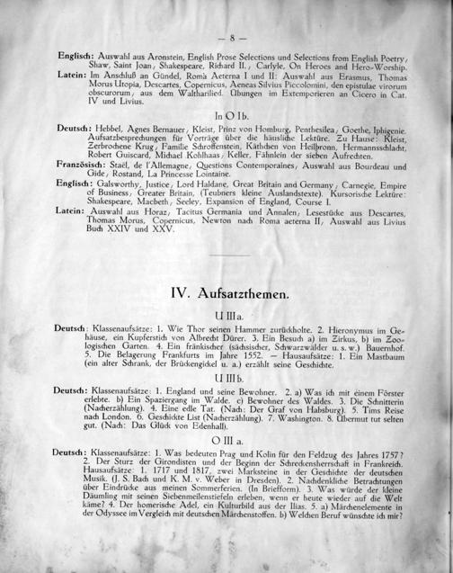 Shaw, Saint Joan, Shakespeare, Richard II., Carlyle, On Heroes and Hero-Worship. Latein: Im Anschluß an Gündel, Roma Neterna l und II: Xuswahl aus Erasmus, Thomas Morus Utopia, Descartes, Copernicus, Neneas Silvius Piccolomini, den epistulae virorum obscurorum, aus dem Waltharilied. Ubungen im Extemporieren an Cicero in Cat.